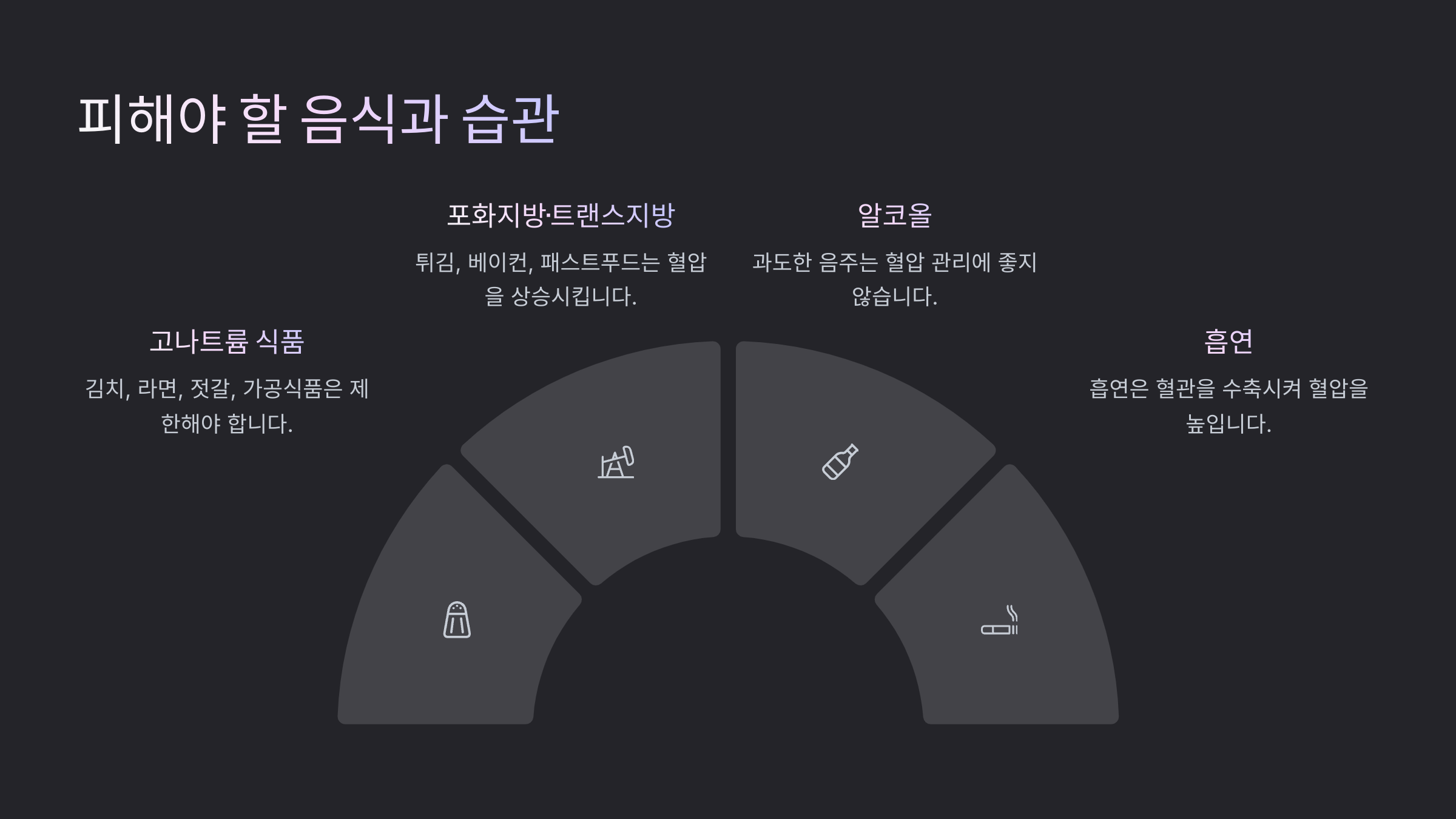 포화지방과 나트륨함량이 높아서 혈압을 높이는 주범이에요.또한 야식, 과식, 음주, 흡연 역시 혈관에 부담을 주기 때문에 개선이 필요해요.
