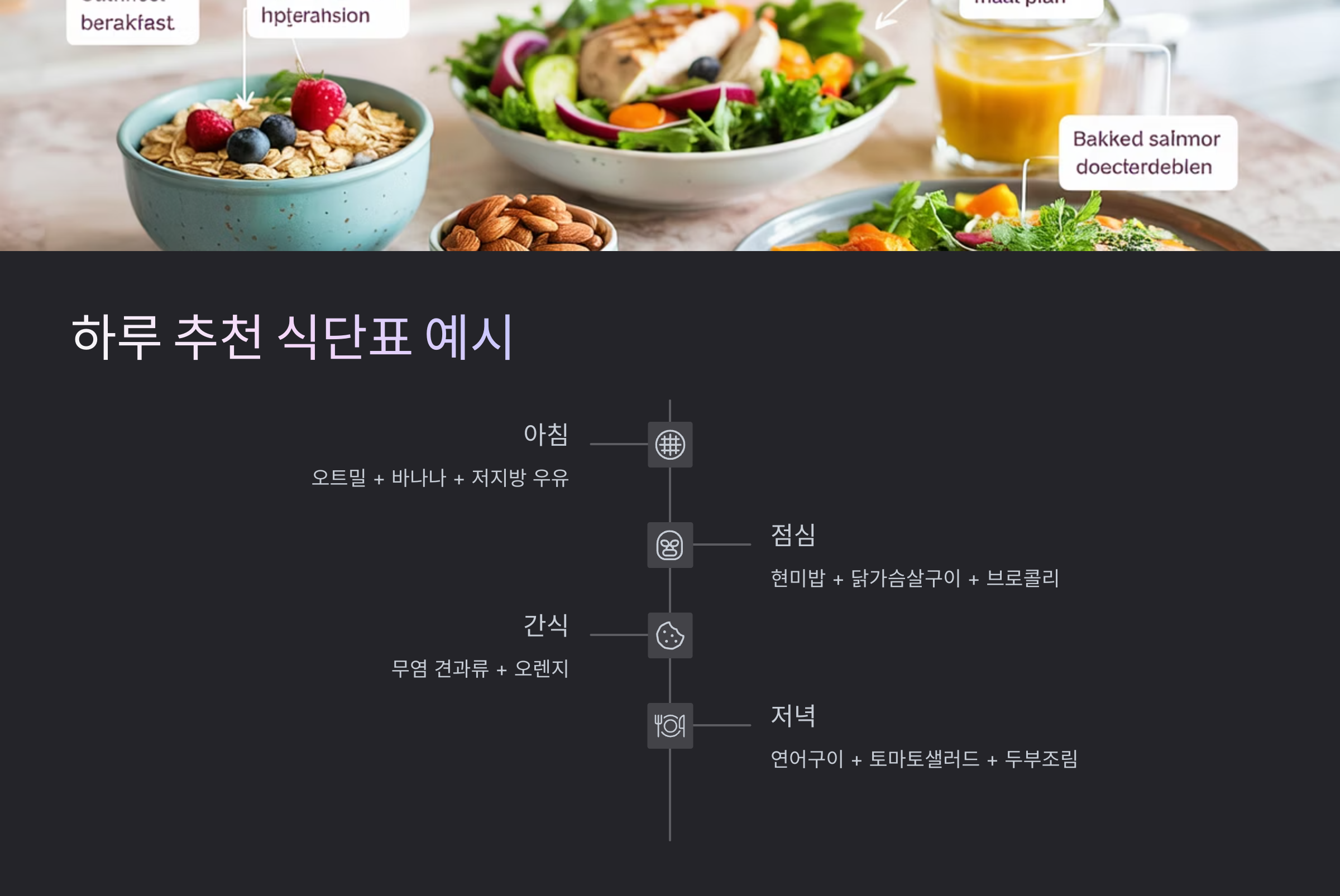 식사 추천 메뉴 특징 아침 현미밥, 구운두부, 오이무침, 사과 염분 낮고 식이섬유 풍부 점심 귀리밥, 된장찌개, 브로콜리, 연두부, 김 칼륨과 마그네슘 포함 저녁 채소쌈, 고등어구이, 현미밥, 다시마국 오메가3 섭취로 혈압 안정 간식 바나나 1개, 무염 아몬드 한 줌 칼륨 보충, 포만감 유지 이 식단은 영양 균형을 맞추면서도 짠맛을 줄이고, 혈관 건강에 도움이 되는 음식들로 구성되어 있어요 😌