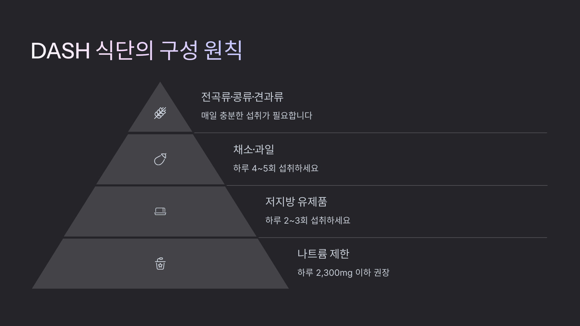 DASH(Dietary Approaches to Stop Hypertension) 식단은 고혈압 예방을 위해 미국에서 개발된 대표적인 식사요법이에요.