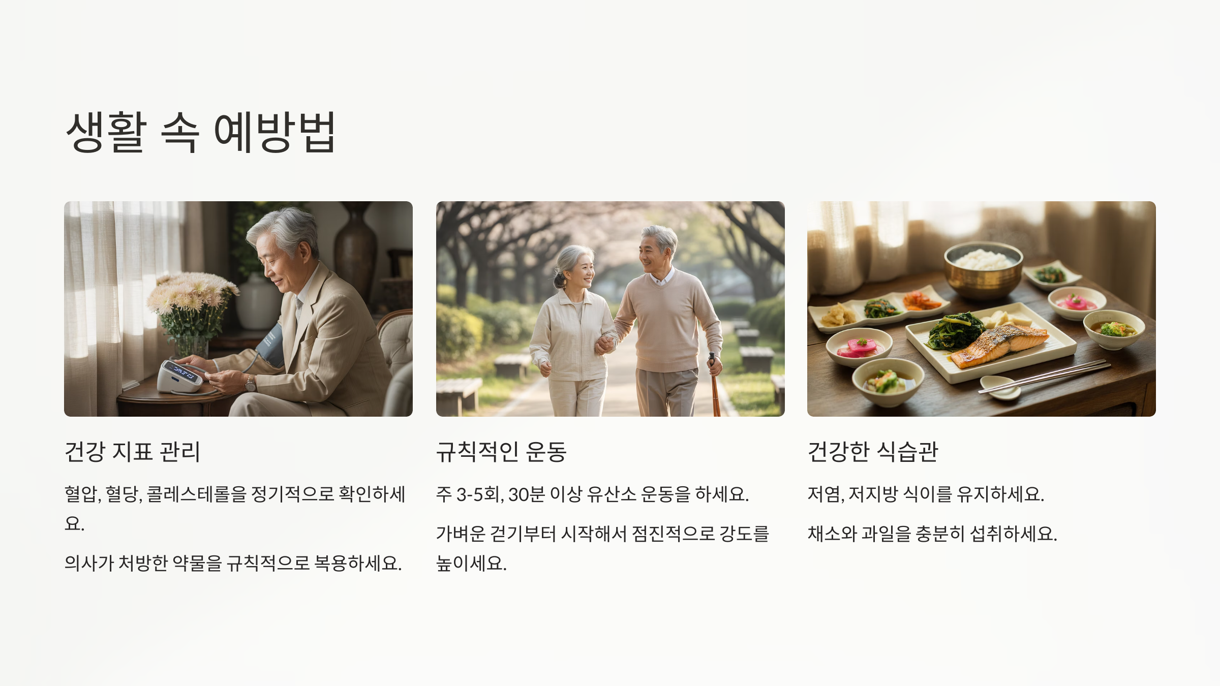 첫 번째는 식습관 관리예요. 짠 음식, 기름진 음식, 가공식품 섭취를 줄이고, 싱겁게 먹는 습관을 들여야 해요. 생선, 채소, 과일, 견과류 위주의 지중해식 식단은 뇌혈관 건강에 큰 도움이 돼요.