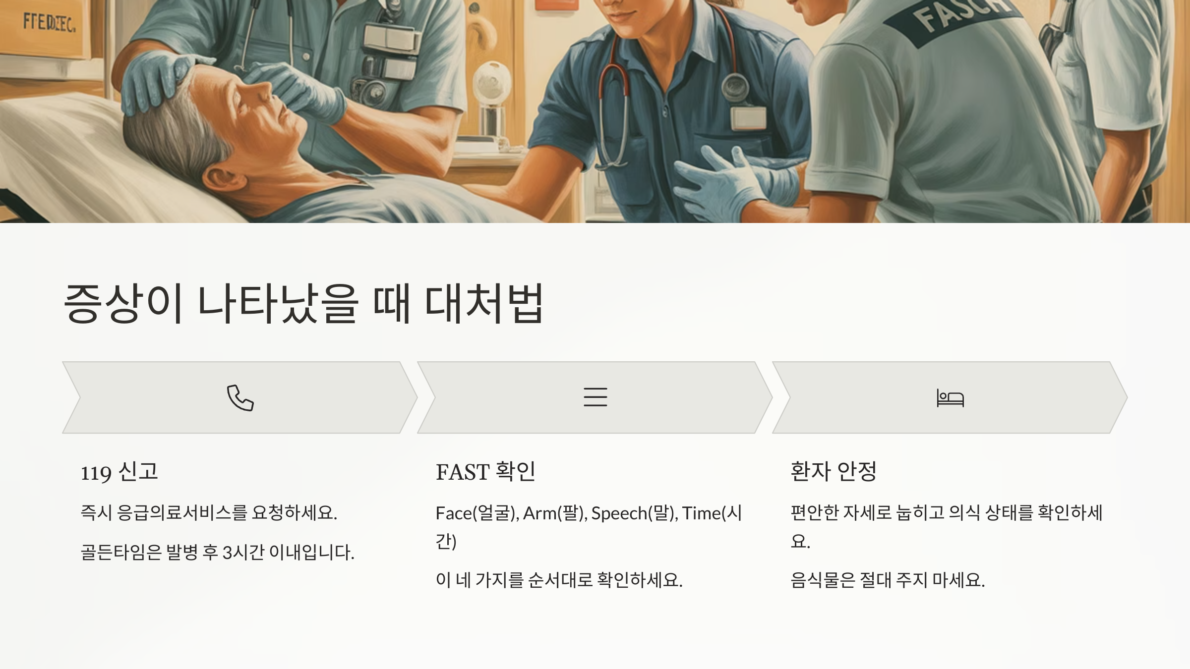 가장 먼저 확인해야 할 것은 'FAST'라는 뇌졸중 체크 기준이에요. 얼굴(Face)이 한쪽으로 쳐졌는지, 팔(Arms)을 들어올릴 수 있는지, 말(Speech)이 어눌하거나 이상한지 확인한 후, 이상이 있다면 시간(Time)을 확인하고 즉시 신고해야 해요.