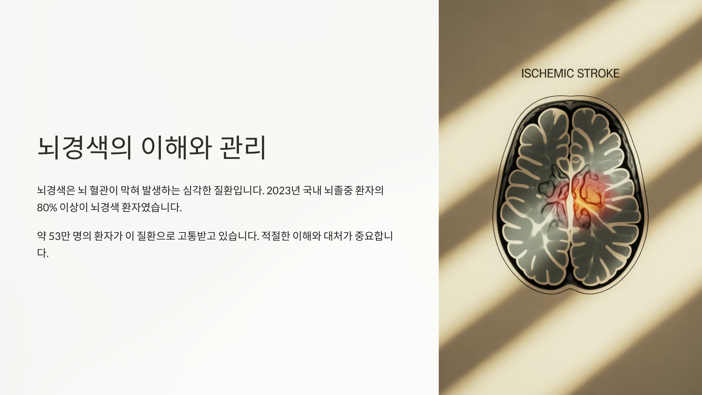 내가 생각했을 때 뇌경색은 '생활 습관병'이라고도 할 수 있어요. 왜냐하면 우리가 평소 먹는 음식, 운동량, 스트레스 정도에 따라 위험이 커질 수 있으니까요.