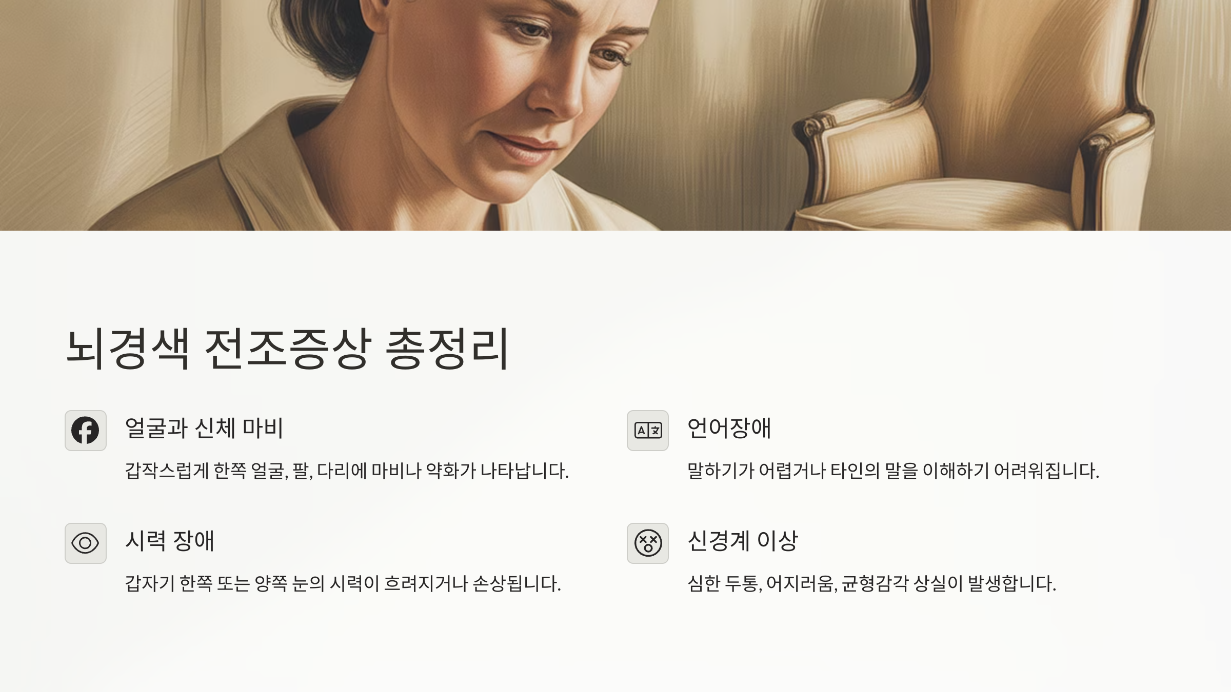 갑자기 한쪽 얼굴이나 팔다리에 힘이 빠지거나, 감각이 이상해지는 증상이 있다면 즉시 병원에 가야 해요. 언어가 어눌해지거나 말이 잘 안 나오고, 상대방의 말을 이해하기 힘들어지는 것도 주요 증상이에요.