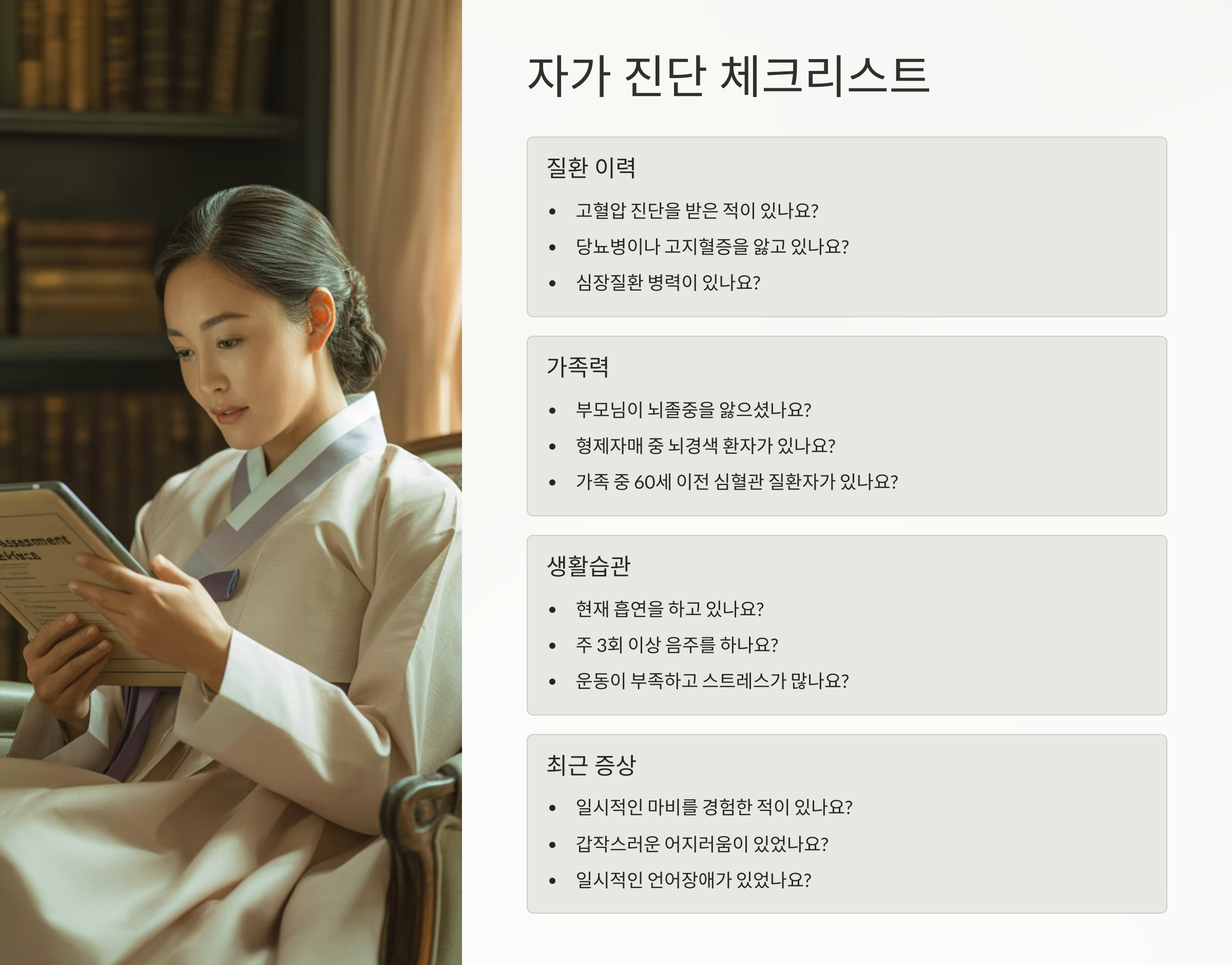내가 뇌경색 위험이 있는지 쉽게 확인할 수 있는 자가 진단 리스트를 소개할게요. 아래 항목에 3개 이상 해당된다면, 반드시 병원을 찾아 정밀검진을 받아보는 것이 좋아요.