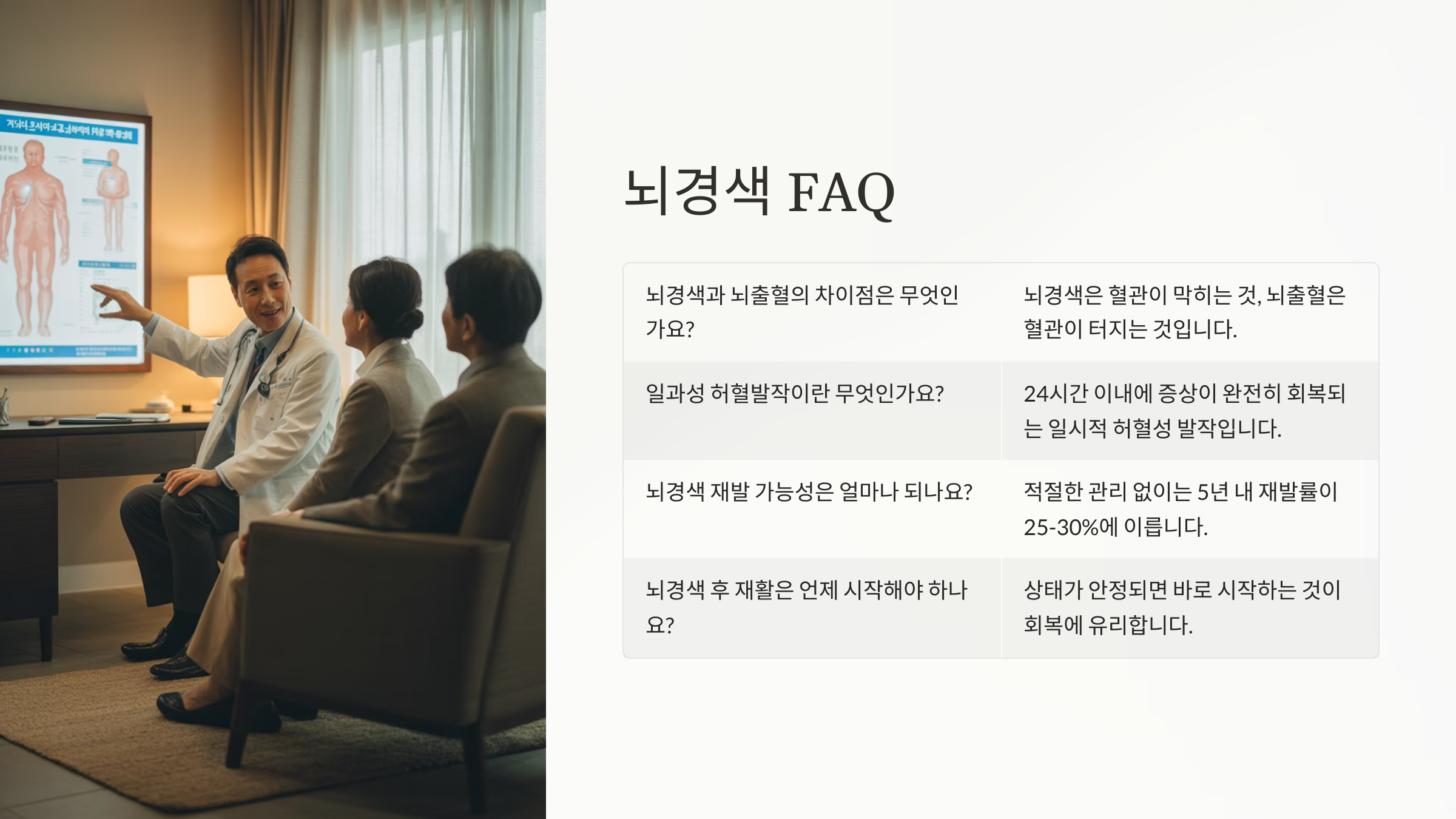 A5. 빠르게 치료를 받으면 큰 후유증 없이 회복되는 경우도 있어요. 하지만 많은 경우 마비나 언어 장애 같은 후유증이 남기 때문에 예방이 가장 중요해요.