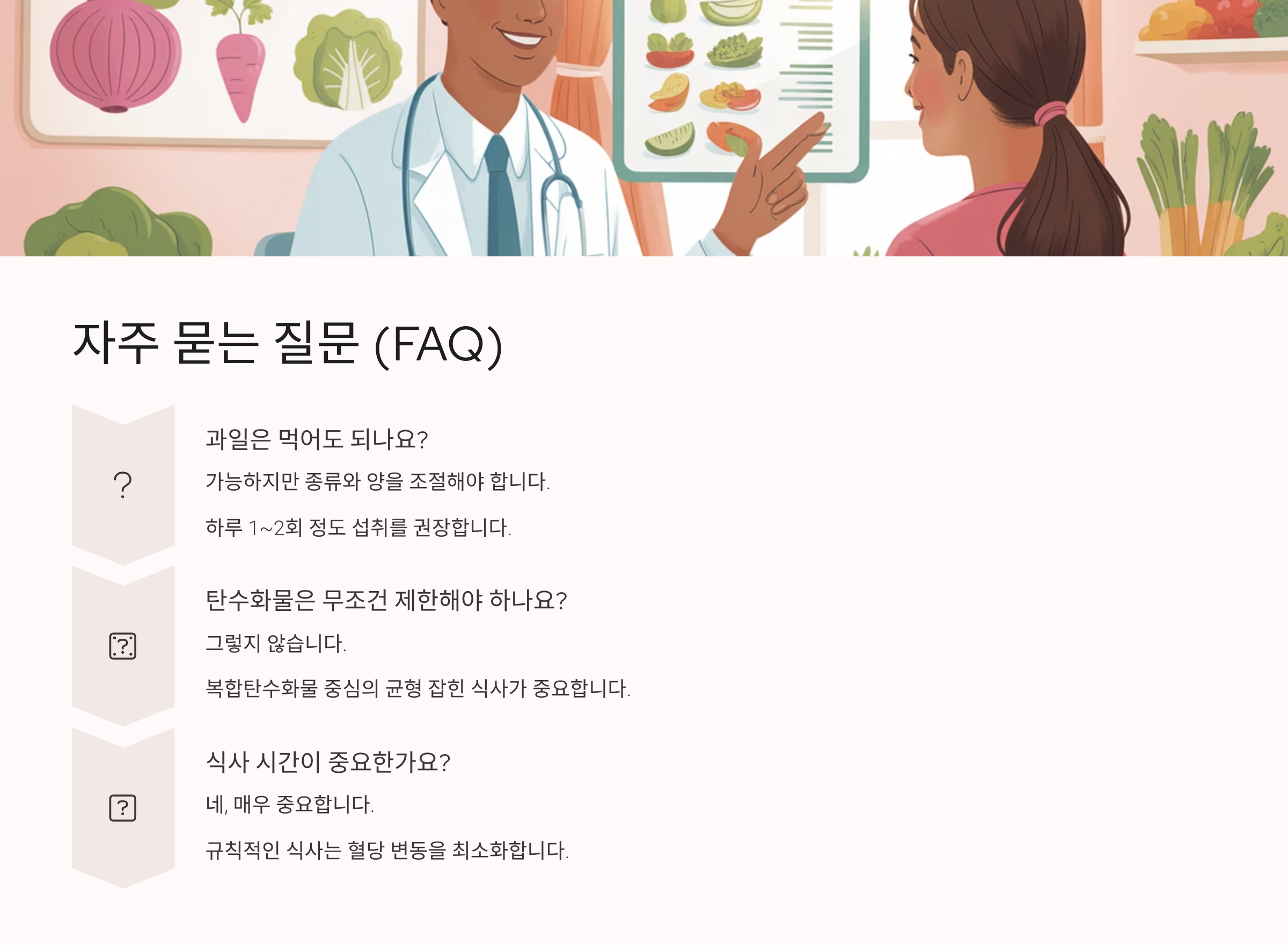 A8. 매우 중요해요! 일정한 시간에 식사하고 간식도 규칙적으로 먹으면 혈당 변동을 줄일 수 있어요. 늦은 야식은 피해야 해요.