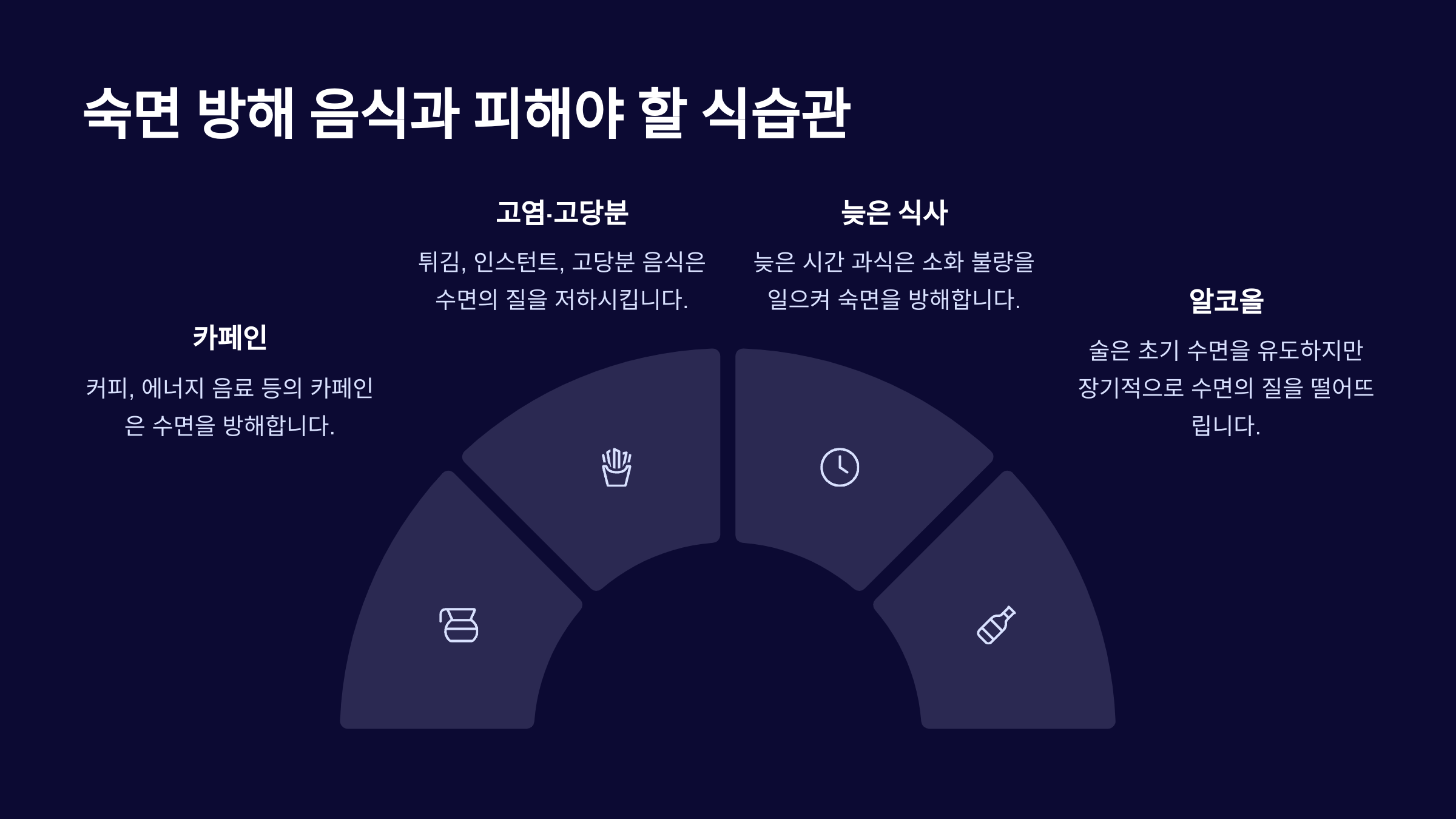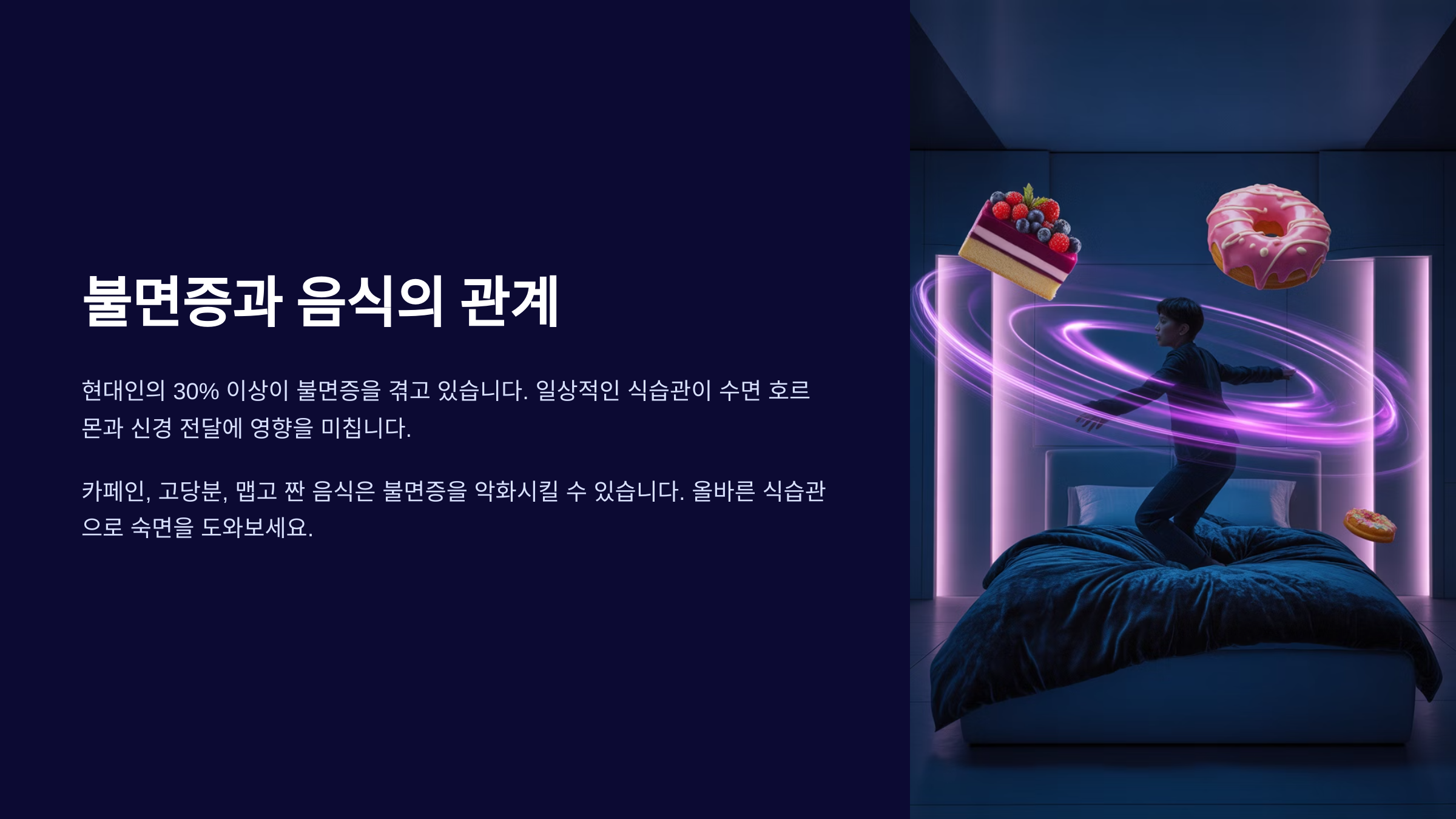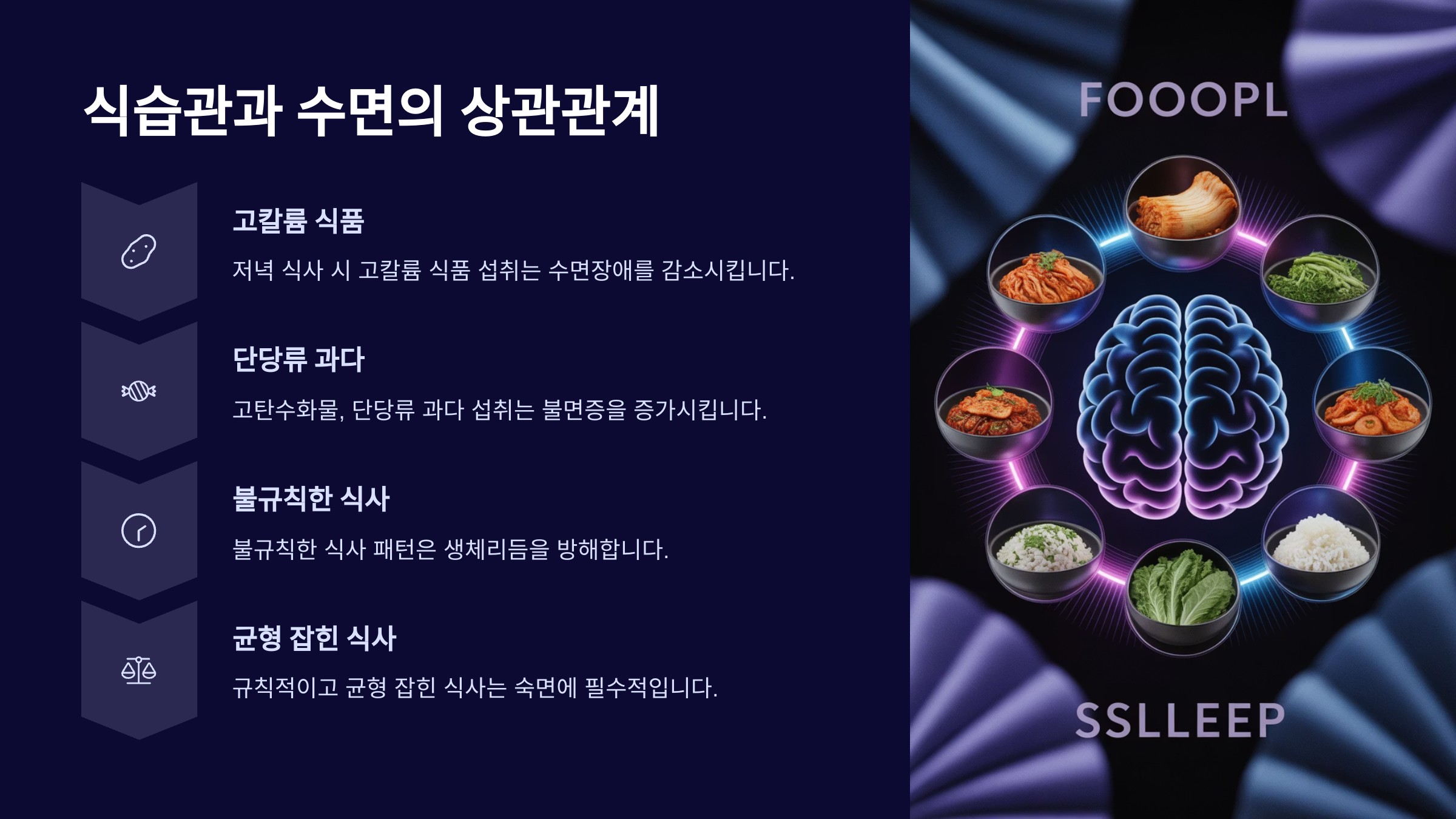 수면은 단순히 ‘언제 자는가’만으로 결정되지 않아요. ‘무엇을, 어떻게 먹는가’도 수면의 질에 아주 큰 영향을 미쳐요. 특히 저녁 식사의 내용과 시간은 숙면 여부를 가르는 중요한 요소예요.