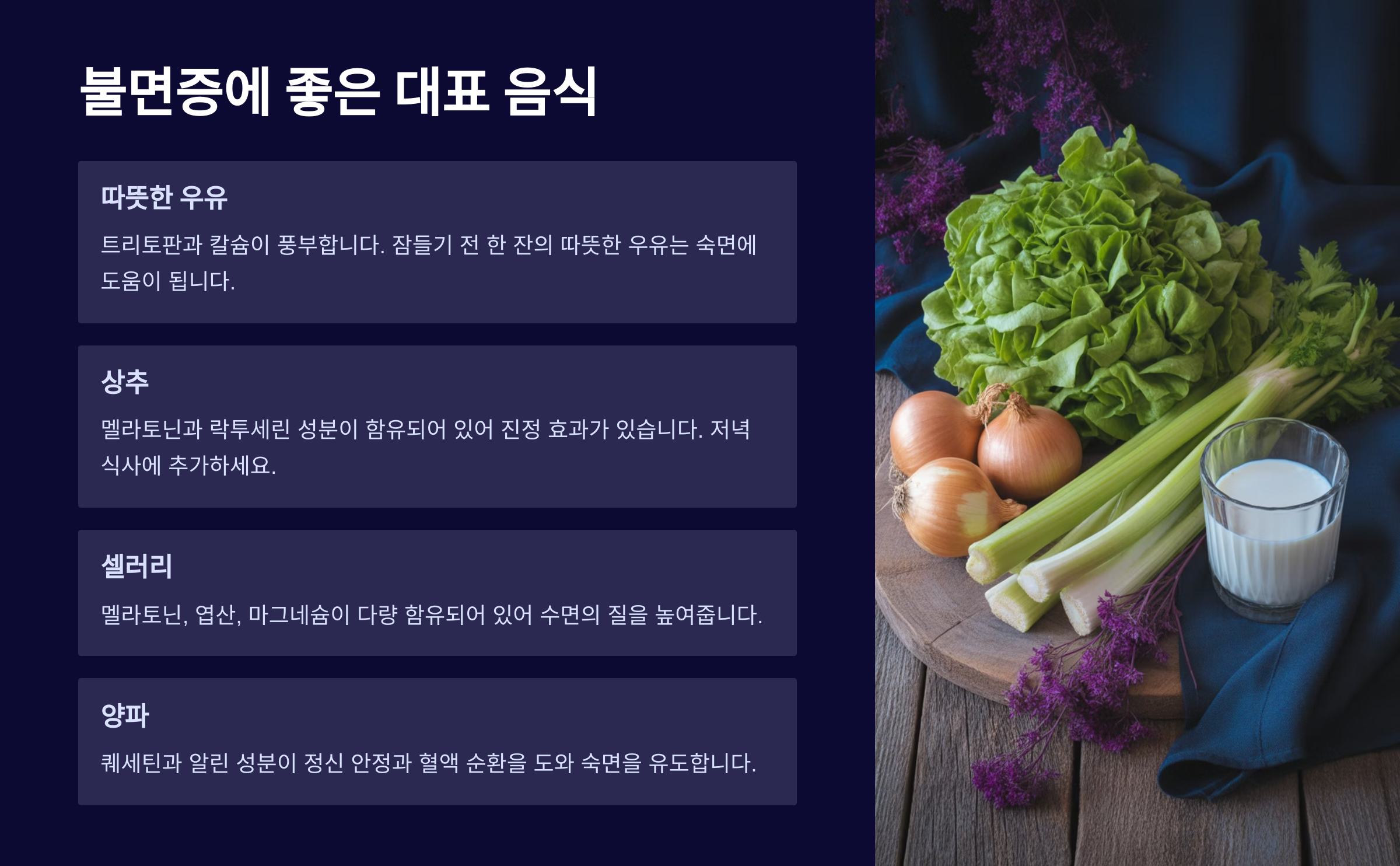 불면증은 단순히 잠을 못 자는 것을 넘어서 삶의 질 전체를 좌우하는 문제예요. 만성적인 수면 부족은 집중력 저하, 면역력 약화, 감정 기복까지 유발할 수 있어요. 많은 사람들이 수면제를 떠올리지만, 자연스럽게 수면을 유도할 수 있는 방법이 바로 '음식'이에요.