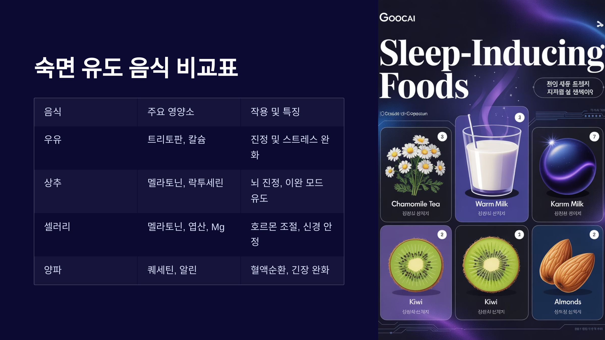 이제 숙면에 꼭 필요한 영양소들을 알았으니, 이 성분들이 많이 들어 있는 대표 음식을 다음에서 알아볼게요. 어떤 음식이 진짜 수면을 부르는지 바로 소개할게요!