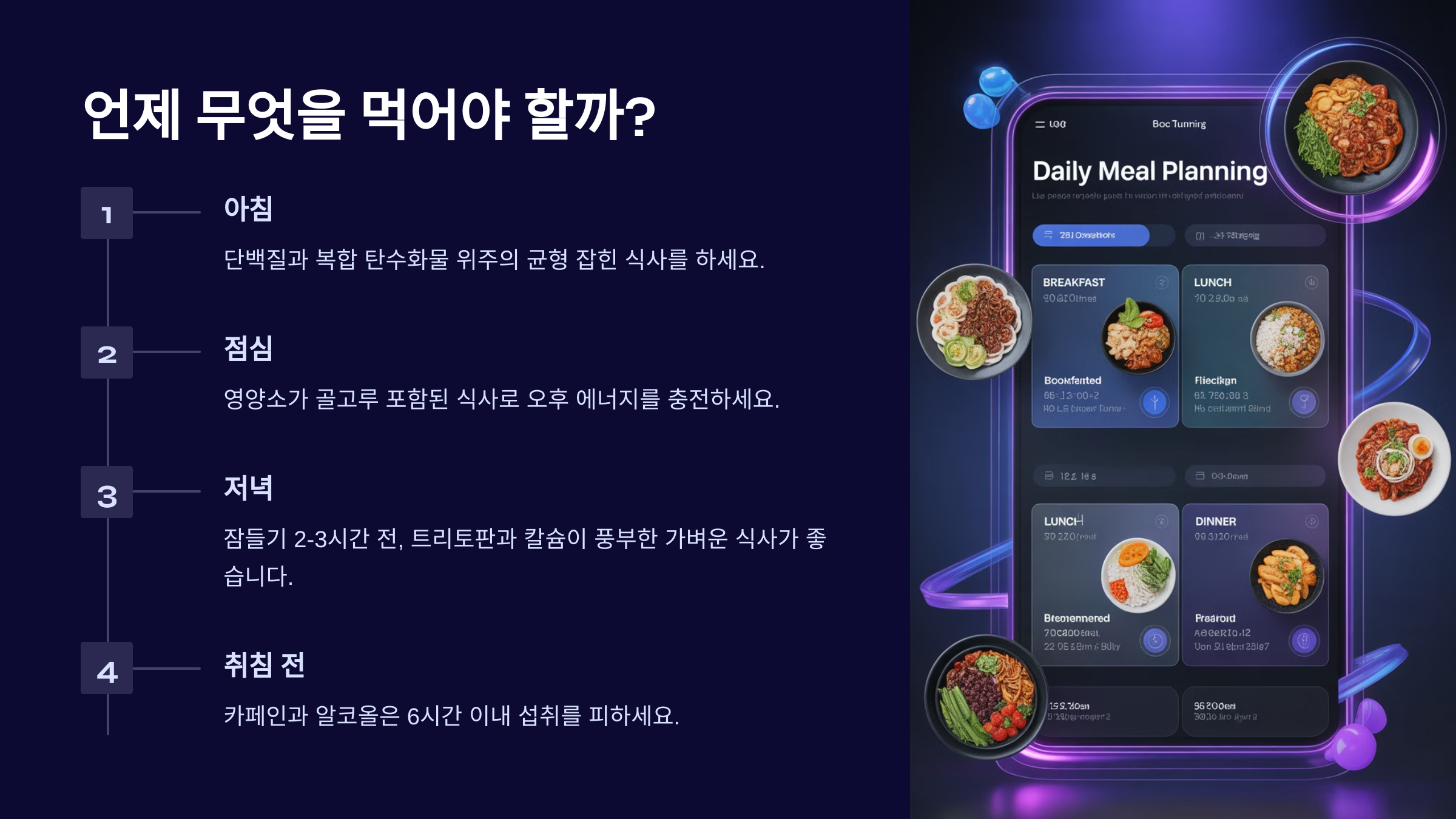 아침은 생체리듬을 깨우는 시점이기 때문에 탄수화물과 단백질을 균형 있게 챙기는 것이 중요해요. 삶은 달걀, 통곡물빵, 바나나 같은 식단이 추천돼요. 이렇게 하루 세 끼가 수면에 영향을 줄 수 있다는 점, 꼭 기억해요!