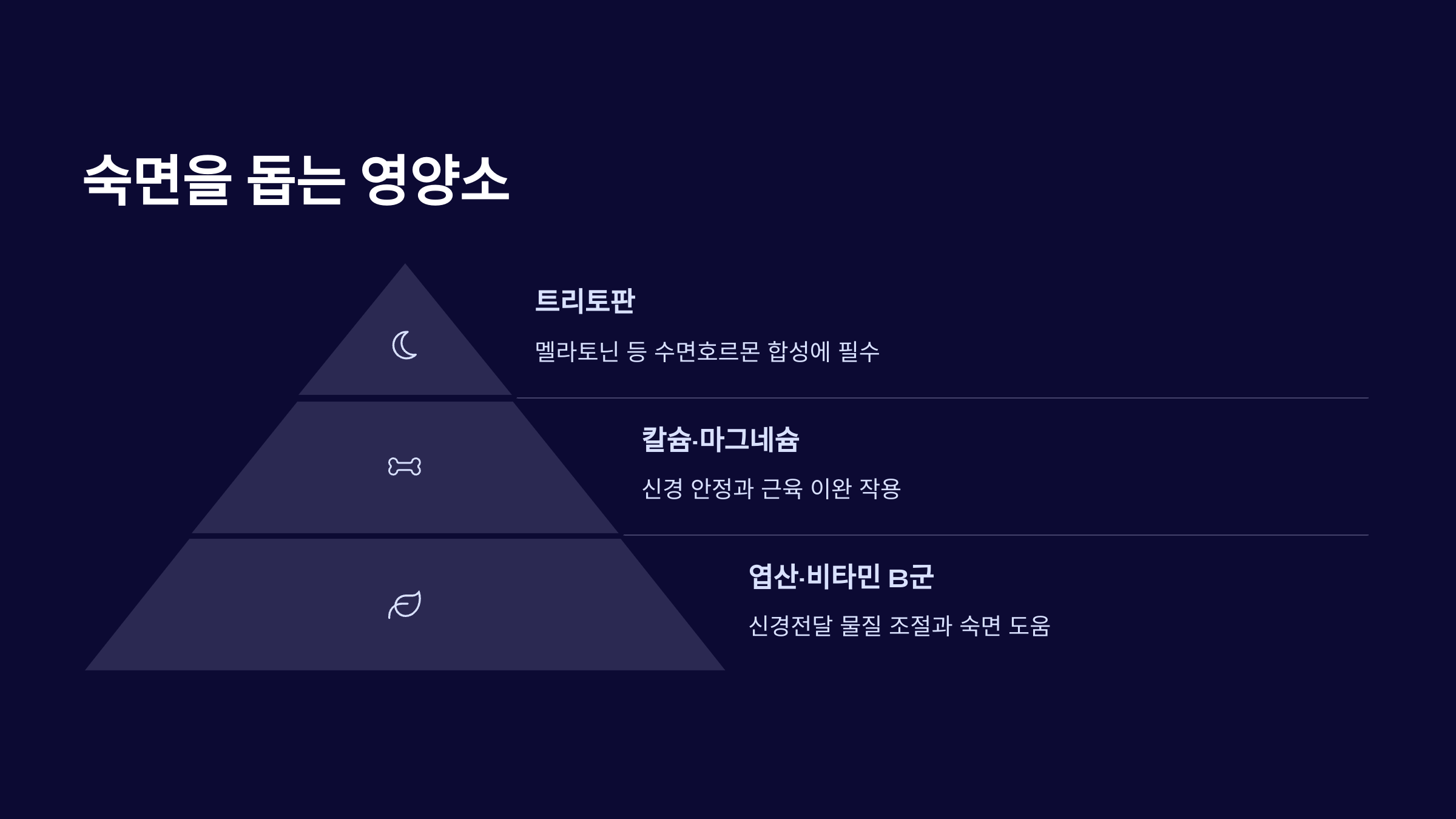 불면증을 개선하려면 단순히 음식을 고르기보다, 그 음식에 어떤 영양소가 들어있는지를 먼저 알아야 해요. 잠을 부르는 핵심 영양소는 크게 다섯 가지예요. 바로 트립토판, 마그네슘, 칼슘, 비타민 B6, 그리고 멜라토닌이에요.