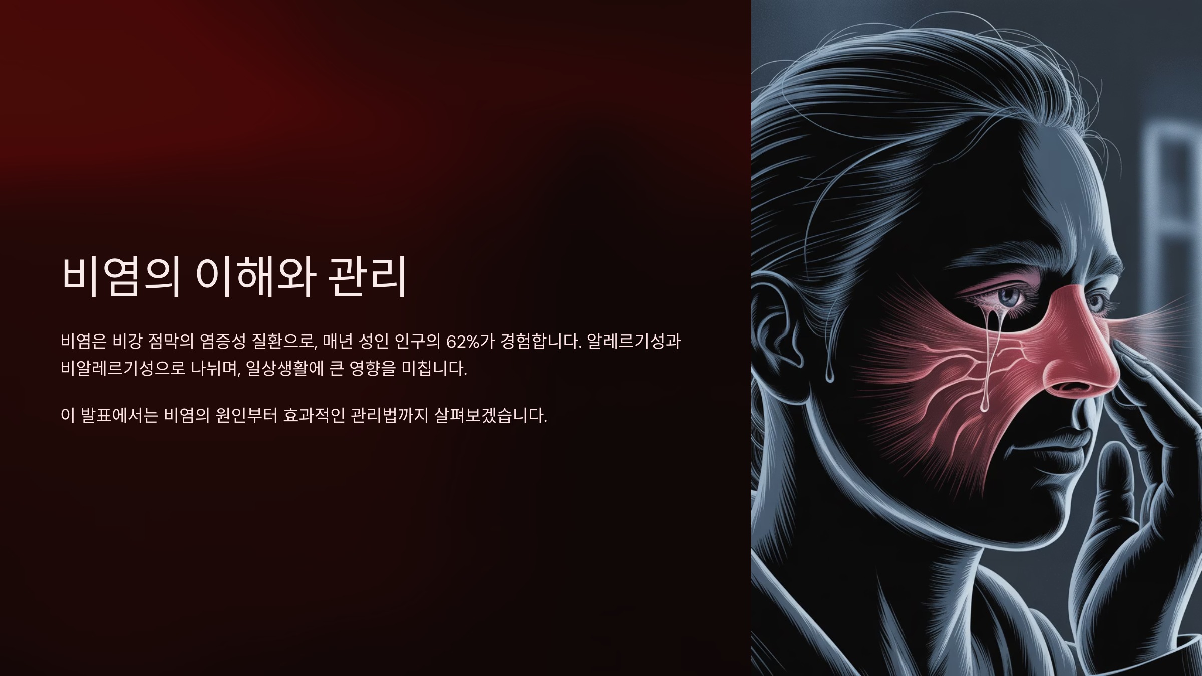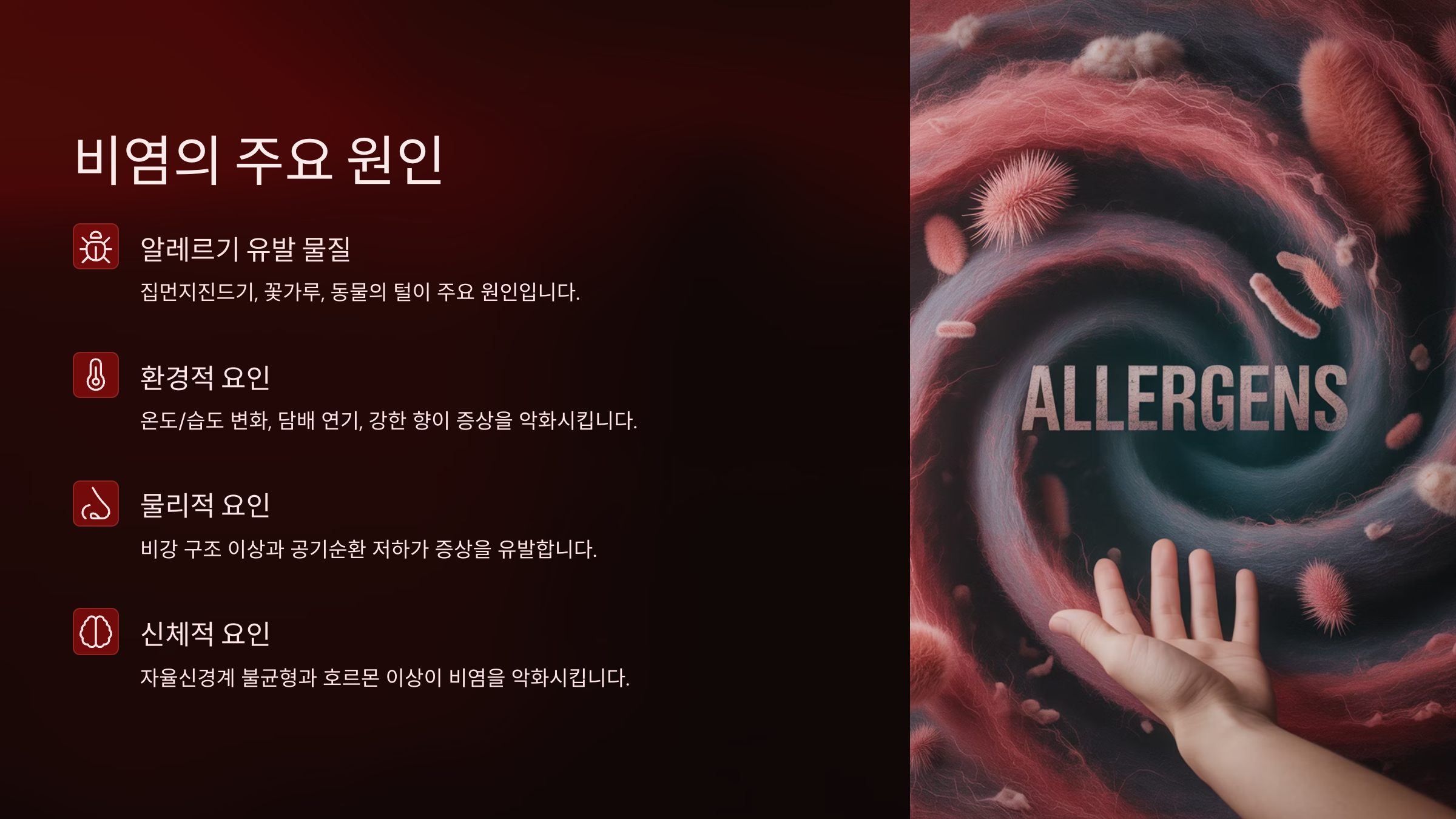 비염은 단순히 코가 예민해서 생기는 것이 아니에요. 다양한 환경적, 유전적 요인들이 복합적으로 작용해서 발생하죠. 가장 흔한 원인은 알레르기 반응이에요. 꽃가루, 집먼지진드기, 반려동물의 털 같은 알레르겐이 코점막을 자극하면 면역 반응이 과도하게 일어나 코막힘, 재채기, 콧물이 생기게 되는 거예요.또한 급격한 온도 변화나 건조한 공기, 스트레스도 비염을 유발하거나 악화시킬 수 있어요. 특히 아침에 기온이 갑자기 낮아질 때 코가 민감하게 반응하면서 증상이 심해지기 쉬워요. 이럴 때는 목도리로 코를 덮는 등 간단한 보온도 큰 도움이 된답니다.