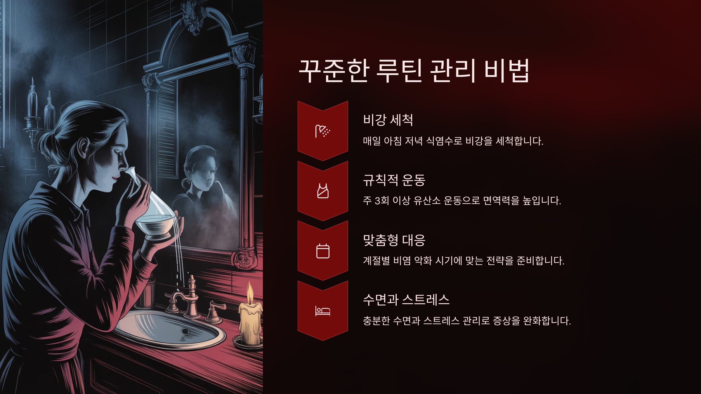 자기 전에는 스마트폰이나 TV 같은 자극적인 기기를 멀리하고, 조용한 음악을 들으며 심신을 안정시켜보세요. 숙면은 몸의 회복과 면역력 강화에 핵심 역할을 하거든요. 11시 이전에 잠드는 것이 가장 이상적이에요. 코 세척과 코 마사지도 자기 전에 해주면 아침 코막힘을 줄일 수 있어요.