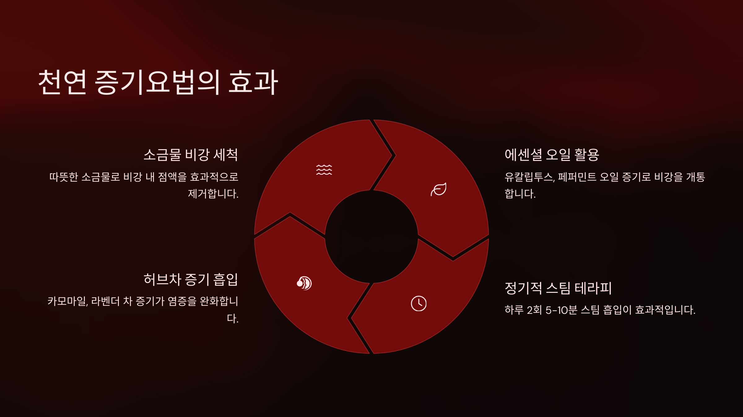 습관 구체적 행동 효과 청결 유지 침구 세탁, 청소기 사용 알레르기 유발물질 제거 적정 습도 유지 가습기, 환기 점막 보호, 자극 최소화 규칙적인 수면 취침시간 고정 면역력 유지 코 세척 식염수로 아침·저녁 세척 이물질 제거, 코막힘 완화 작은 습관들이 모이면 비염 증상을 확실히 줄일 수 있어요. 다음은 자연의 힘을 활용하는 천연 증기요법에 대해 알아볼 차례예요! 🌿