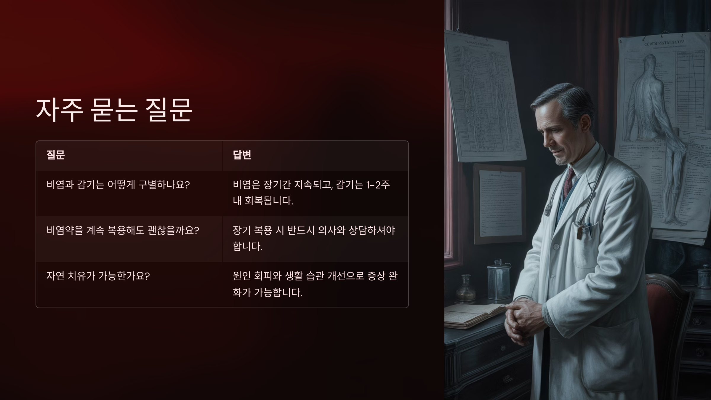 Q1. 비염은 완치가 가능한가요?A1. 비염은 체질적인 요인이 크기 때문에 완치보다는 꾸준한 관리로 증상을 줄이는 게 현실적인 목표예요. 자연 치유 습관을 지속하면 약 없이도 생활이 훨씬 편안해질 수 있어요.