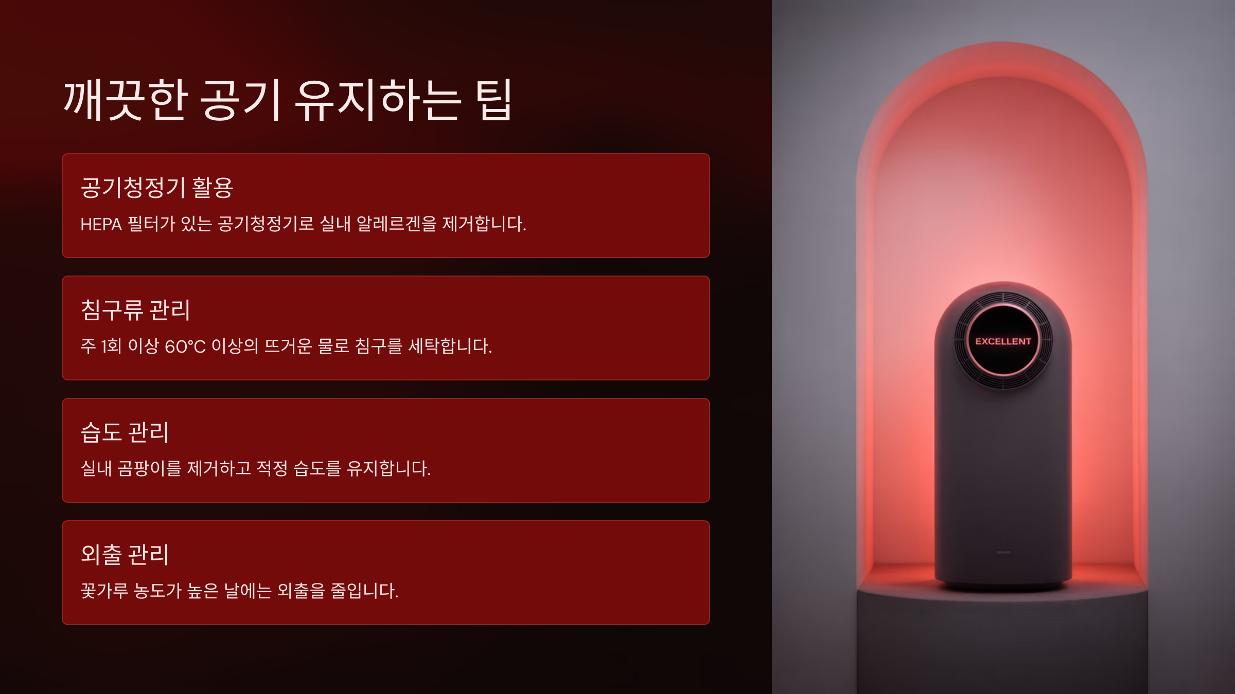 아침, 저녁으로 하루에 두 번 정도 10분씩 창문을 열어 자연 환기를 시켜주세요. 날씨가 미세먼지 없는 날을 선택하는 것도 중요하죠. 외부 공기가 나쁠 경우에는 공기청정기를 가동하는 것이 효과적이에요. 특히 HEPA 필터가 있는 공기청정기는 미세먼지와 알레르겐을 효과적으로 걸러줘요.
