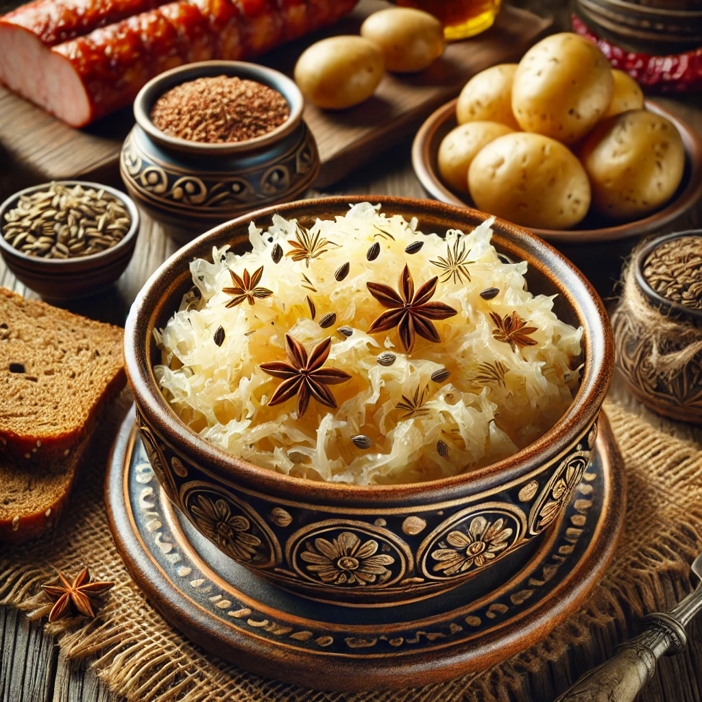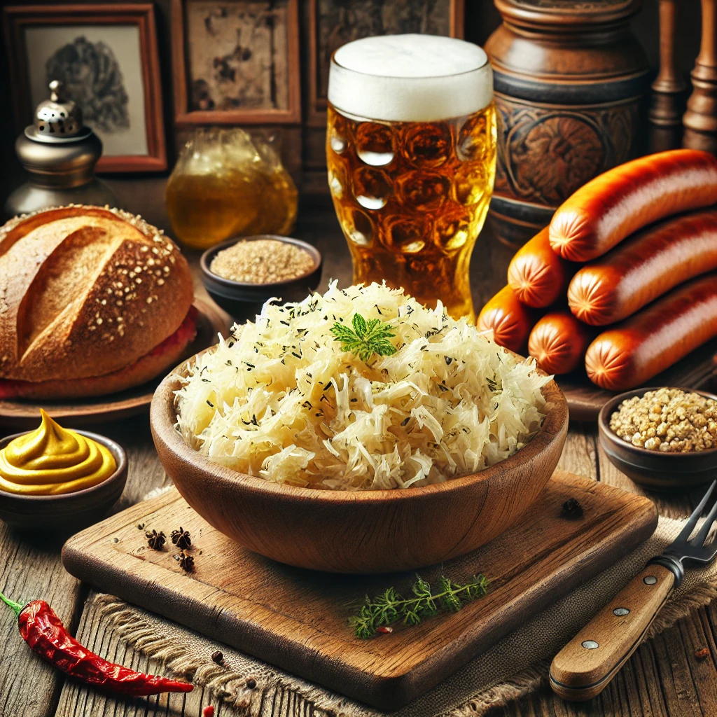 사우어크라우트는 독일의 대표적인 발효식품으로, 양배추를 소금에 절여 발효시킨 음식입니다. 그 신맛과 아삭한 식감이 특징으로, 주로 소시지나 고기 요리에 곁들여 먹습니다.