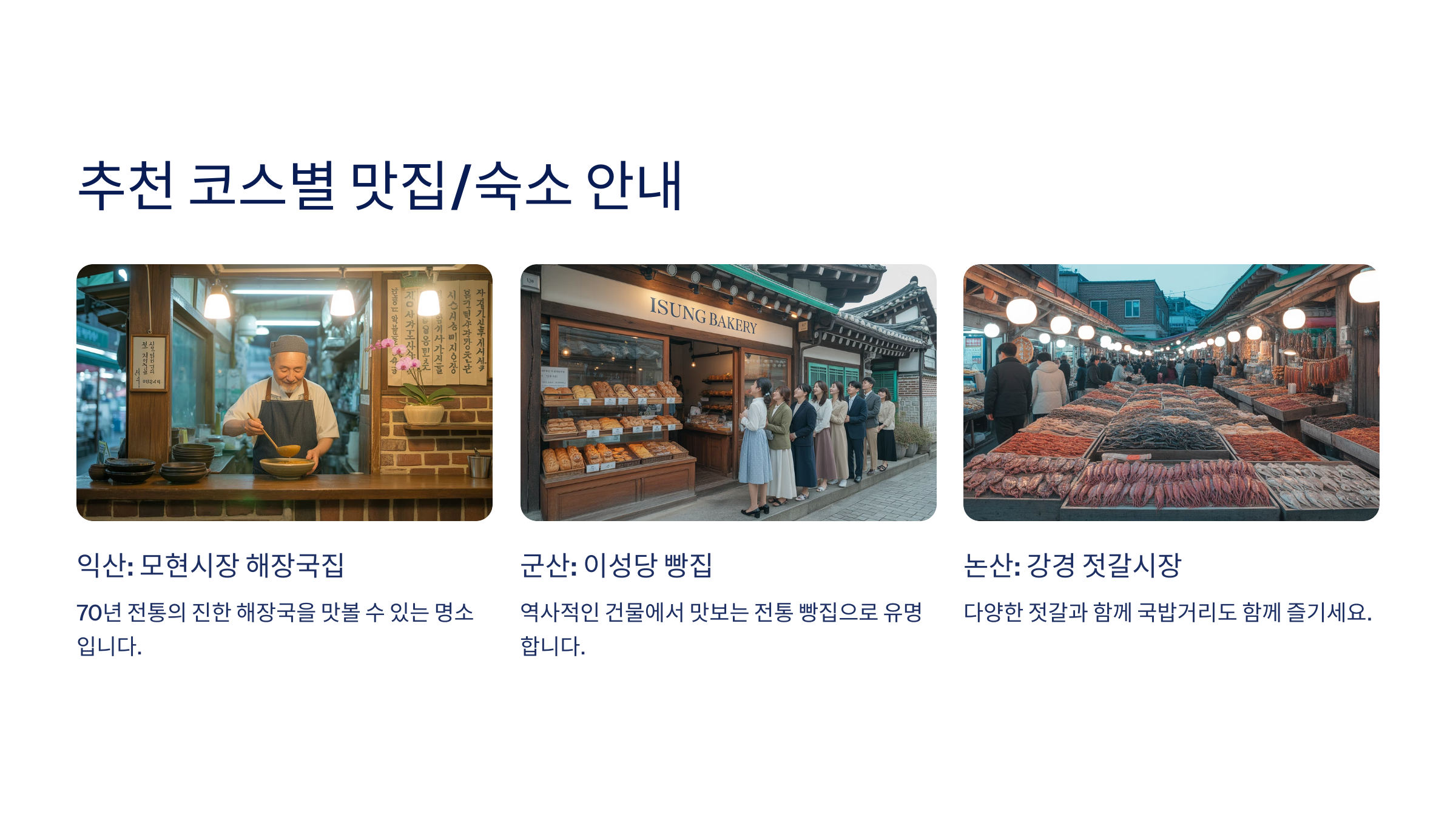 이번엔 각 지역별로 추천했던 자전거 코스 주변에 위치한 인기 맛집과 합리적인 숙소를 소개할게요. 여행 중 중간 휴식지로도 좋고, 1박 2일 계획이라면 참고하시면 딱이에요!