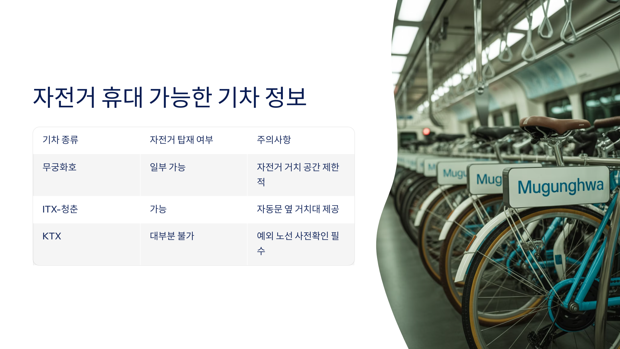 자전거를 타고 기차여행을 즐기기 위해선, 어떤 열차가 자전거 반입을 허용하는지 아는 게 정말 중요해요. 다행히도 국내에는 자전거 반입이 가능한 열차들이 꽤 많답니다. 🚴♀️