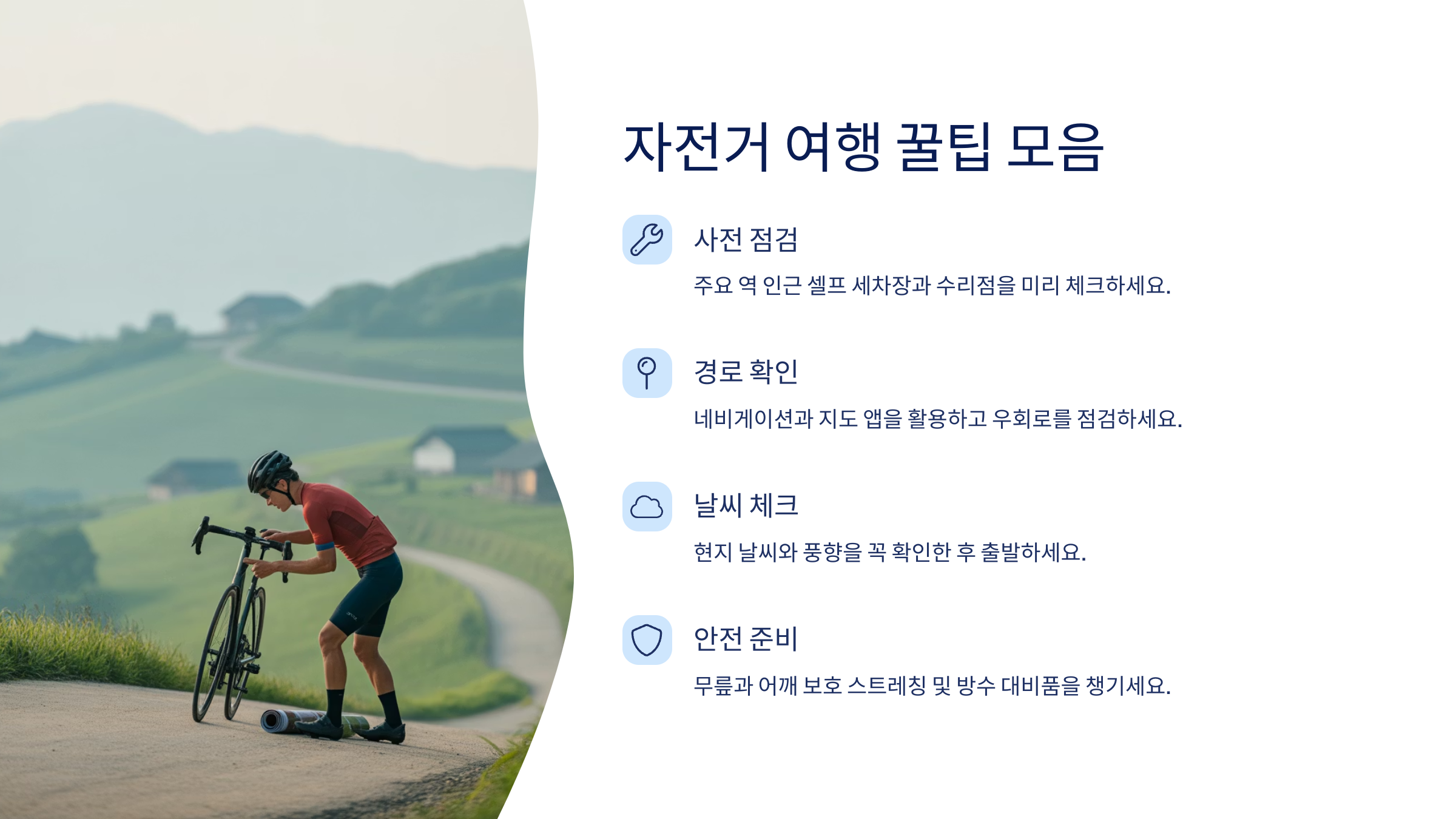 다음 섹션에서는 자전거 여행 시 꼭 알아두면 좋은 꿀팁과 코스별 맛집, 숙소, 필수 준비물도 알려드릴게요! 🧳🚴‍♂️
