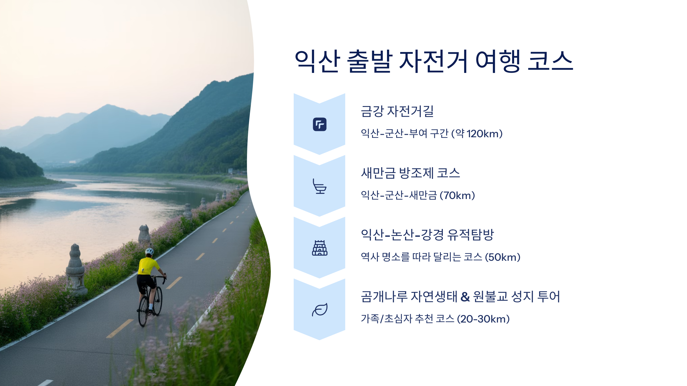 코스명 출발역 거리 추천 포인트 난이도 익산→금강 자전거길 익산역 38km 금강 둔치, 논산 방향 초급 정읍 내장산 벚꽃길 정읍역 22km 봄꽃, 내장산 단풍 중급 군산 금강철길공원 군산역 17km 해질녘 뷰, 야경 명소 초급 김제 벽골제 로드 김제역 20km 논길, 벽골제 역사 초급 남원 광한루~춘향테마길 남원역 25km 한옥, 문화 산책 중급 이외에도 익산에서 부안, 완주, 임실 등으로 향하는 코스들이 다양해요. 일부는 무궁화호, 일부는 S-Train으로 자전거를 실을 수 있으니 사전에 확인만 하면 누구나 쉽게 떠날 수 있답니다.