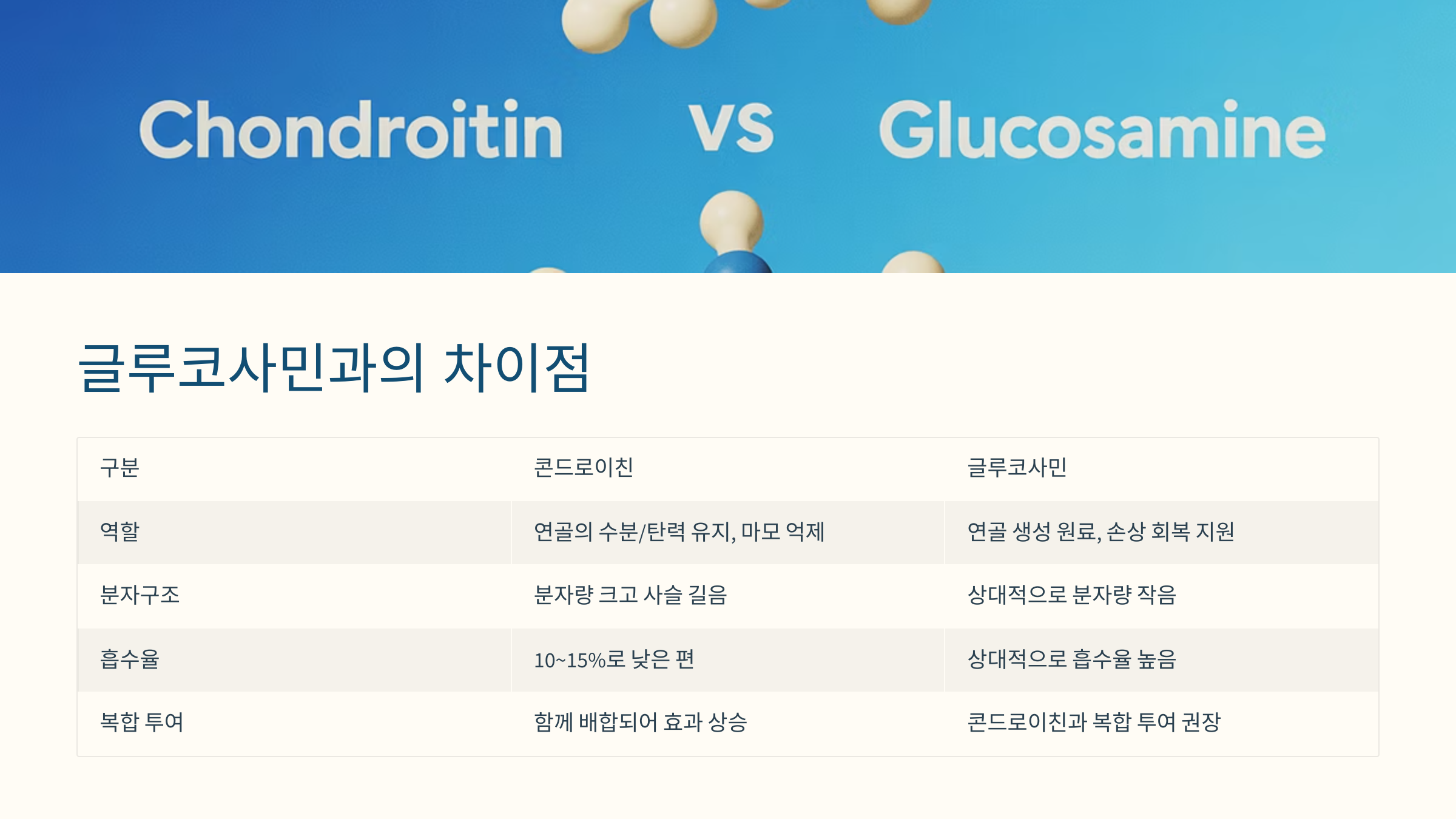 효과를 보기 위해선 너무 과도한 기대보다는 일정 기간 꾸준히, 규칙적으로 복용하는 게 핵심이에요. 관절 건강은 하루아침에 회복되진 않지만, 생활 습관과 병행하면 충분히 좋아질 수 있어요. 아래에서는 '글루코사민과의 차이'에 대해 알아볼게요! 🔍