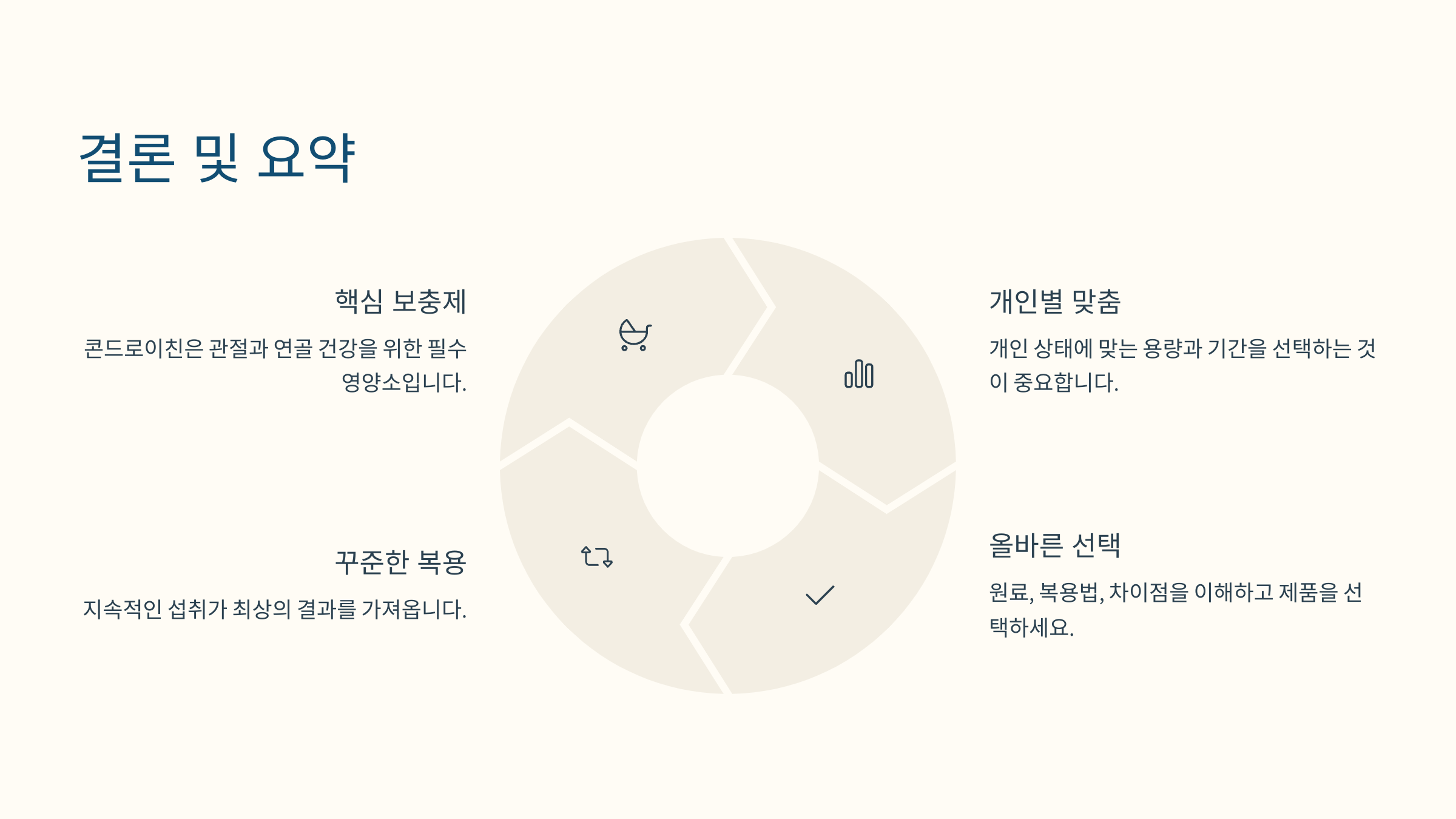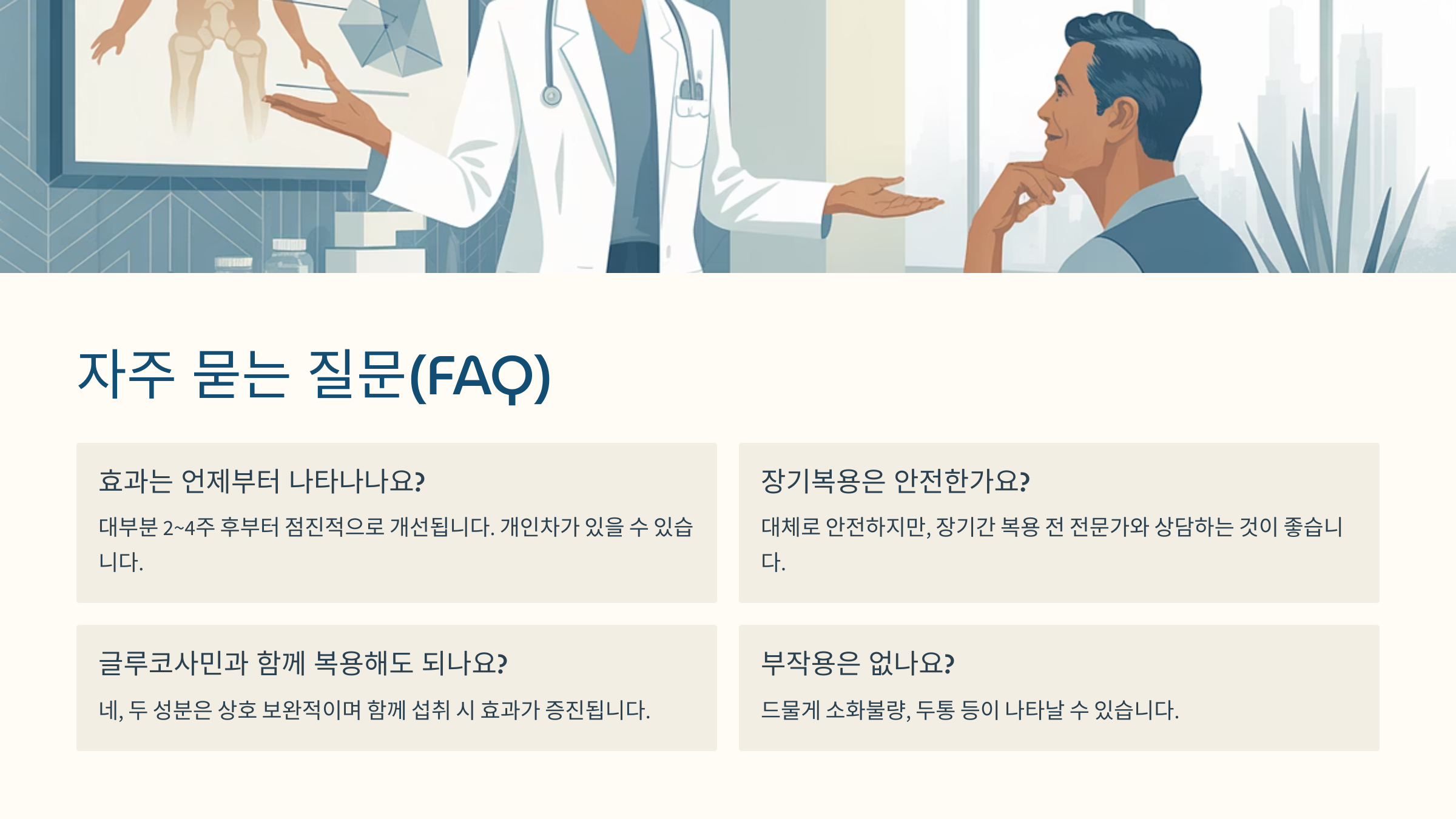 두 성분 모두 꾸준한 섭취가 관건이에요. 단기간에 눈에 띄는 효과를 기대하기보다는, 2~3개월 이상 장기적으로 복용하며 생활 습관 개선과 병행하는 것이 중요해요. 관절 건강은 평소 관리가 가장 큰 투자라는 사실, 잊지 마세요!