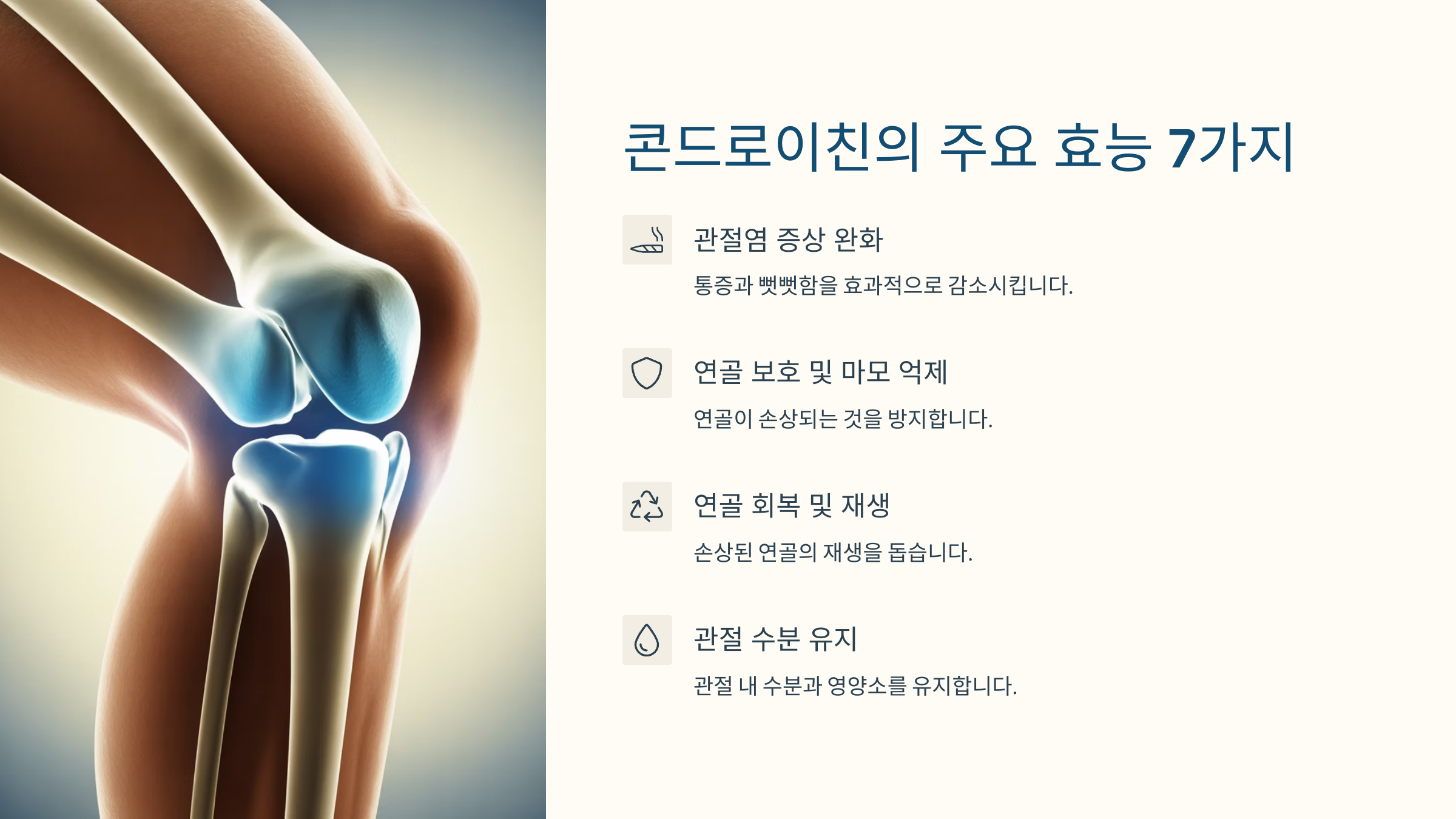 두 번째 효능은 연골 손상 방지예요. 우리 몸의 연골은 자가 재생 능력이 아주 낮아서 한 번 손상되면 회복이 어렵거든요. 그런데 콘드로이친은 연골세포의 활성을 돕고, 연골 구조를 유지해주는 역할을 하니까 연골의 마모를 예방할 수 있어요.