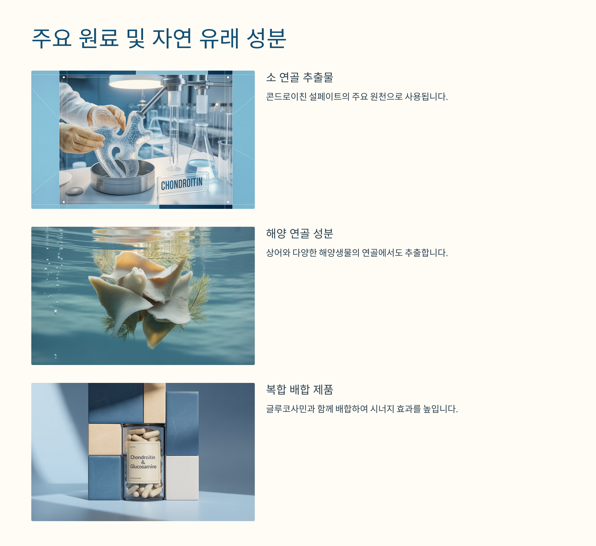 효능만 봐도 정말 다양한데요, 단순히 관절만을 위한 성분이 아니라는 점이 인상적이에요. 다음 박스에서는 ‘자연에서 얻을 수 있는 콘드로이친 원료’에 대해 알아볼게요! 🍃
