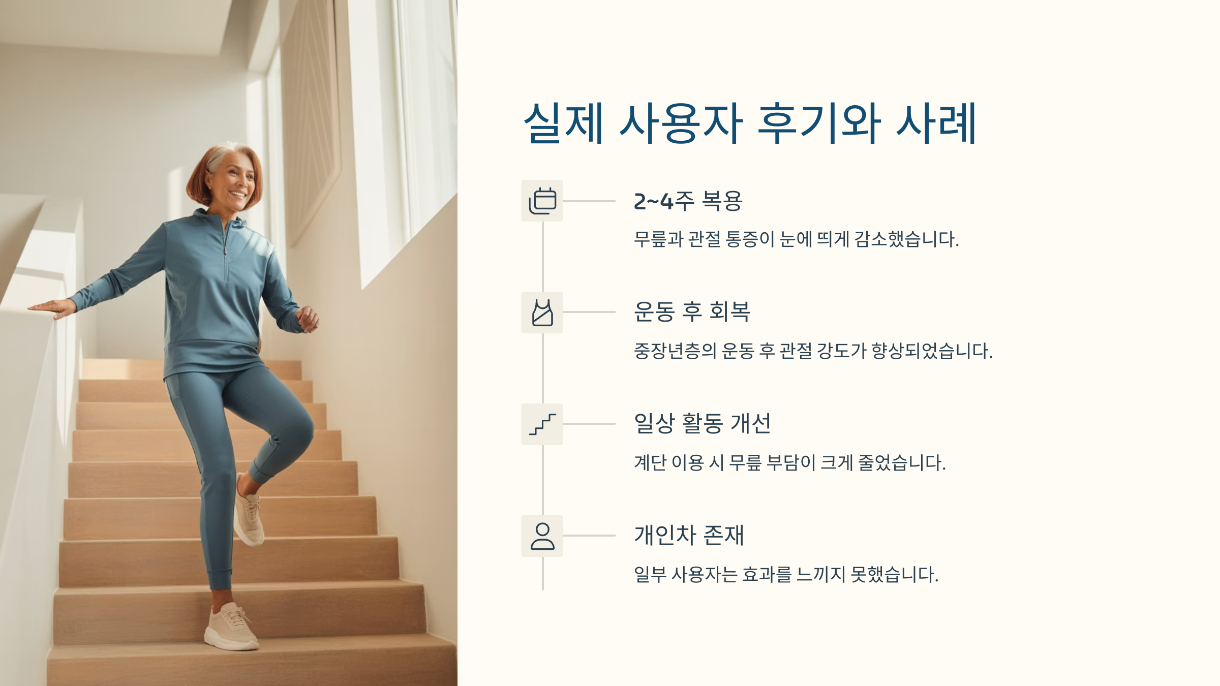 연령대 복용 이유 체감 효과 60대 이상 무릎 통증 완화, 관절 강화 계단 오르기 쉬워짐 40~50대 허리, 고관절 통증 앉아 있을 때 덜 뻐근함 30대 운동 후 관절 보호 회복력 향상, 유연성 증가 20대 헬스, 요가 관절 예방 부상 예방, 유연함 유지 주관적 체감이기 때문에 누구나 똑같은 효과를 느끼진 않지만, 전체적으로 복용자들은 긍정적인 반응을 보이는 경우가 많아요. 특히 통증 감소나 움직임 개선에 대한 만족도가 높았어요. 하지만 일부는 효과가 느리게 나타나거나 거의 못 느낀 사람도 있었어요.