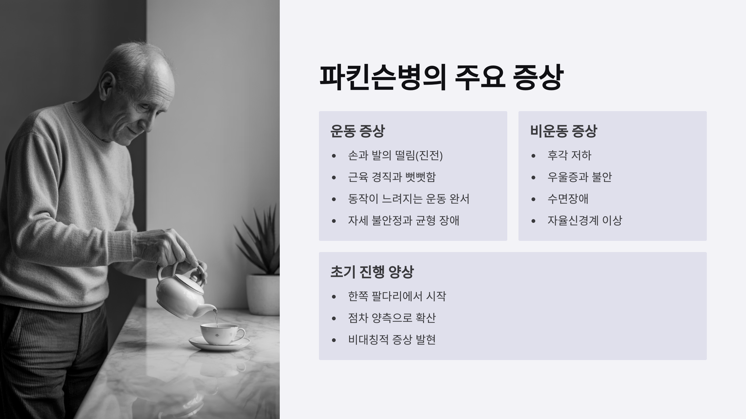 A2. 초기에는 손 떨림, 발걸음이 작아지는 느낌, 말수가 줄어드는 등의 미묘한 변화가 생겨요. 후각 저하나 변비도 초기 징후일 수 있어서 잘 관찰해야 해요.