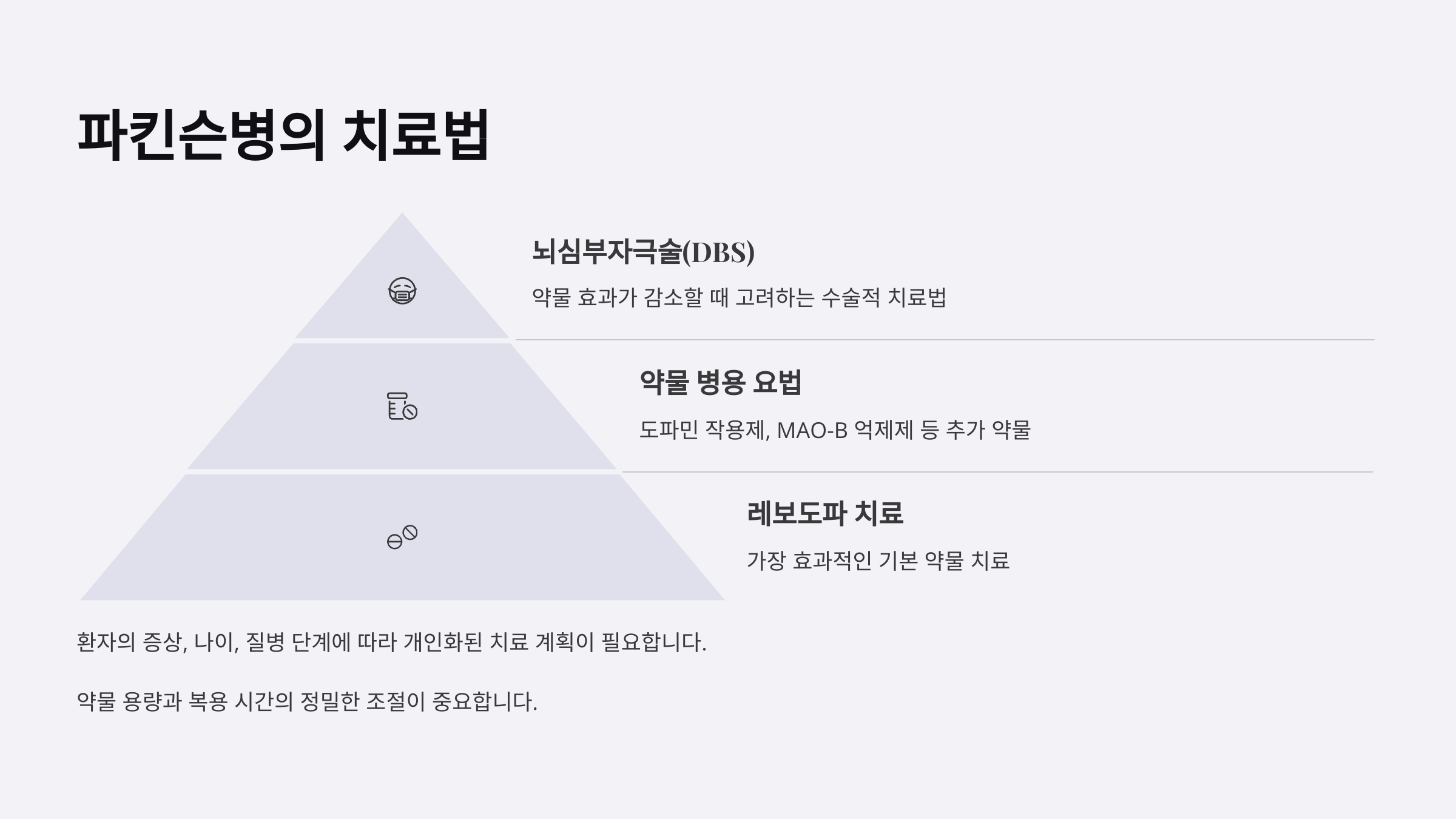 파킨슨병은 현재 완치할 수 있는 방법은 없지만, 다양한 치료로 증상을 조절하고 삶의 질을 높일 수 있어요. 가장 기본적인 치료는 약물치료인데, 도파민이 부족해서 생기는 병이므로 이를 보충하거나 도와주는 약이 핵심이에요. 약물은 증상에 따라 개인 맞춤형으로 조절돼요.