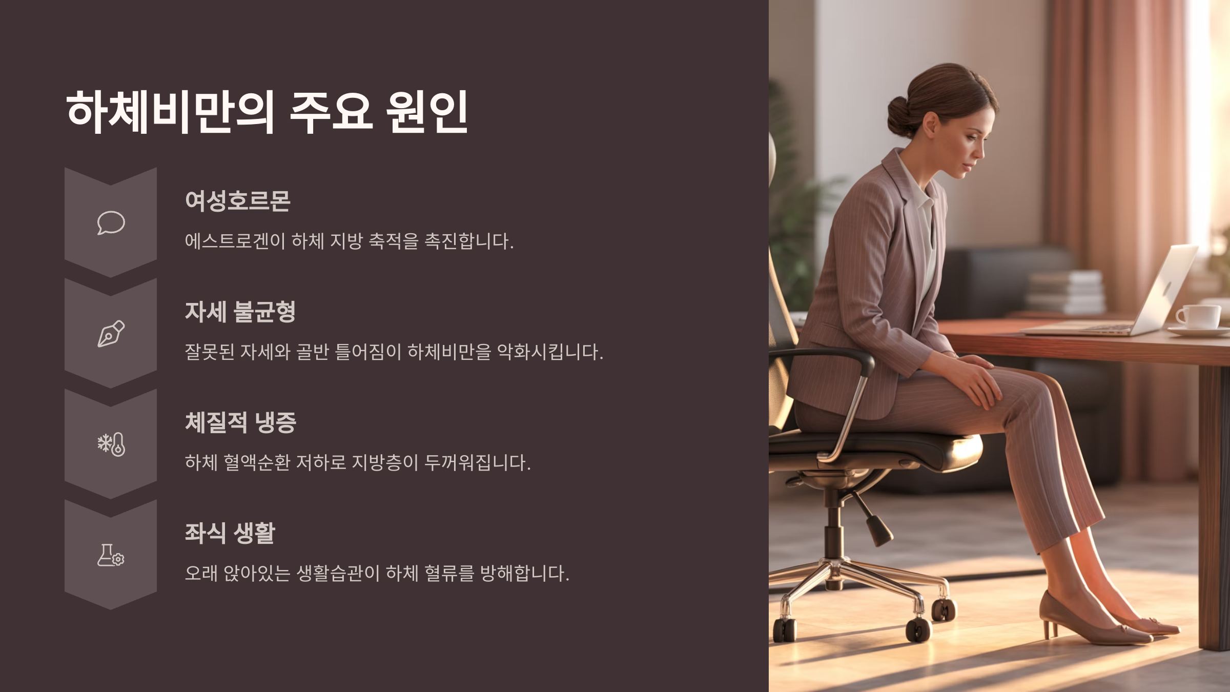 7. 잘못된 자세: 골반이 틀어져 있거나, 다리를 꼬고 앉는 습관은 체형을 비틀고 하체비만을 유발해요. 바른 자세를 유지하는 것만으로도 하체 관리에 큰 도움이 될 수 있어요.