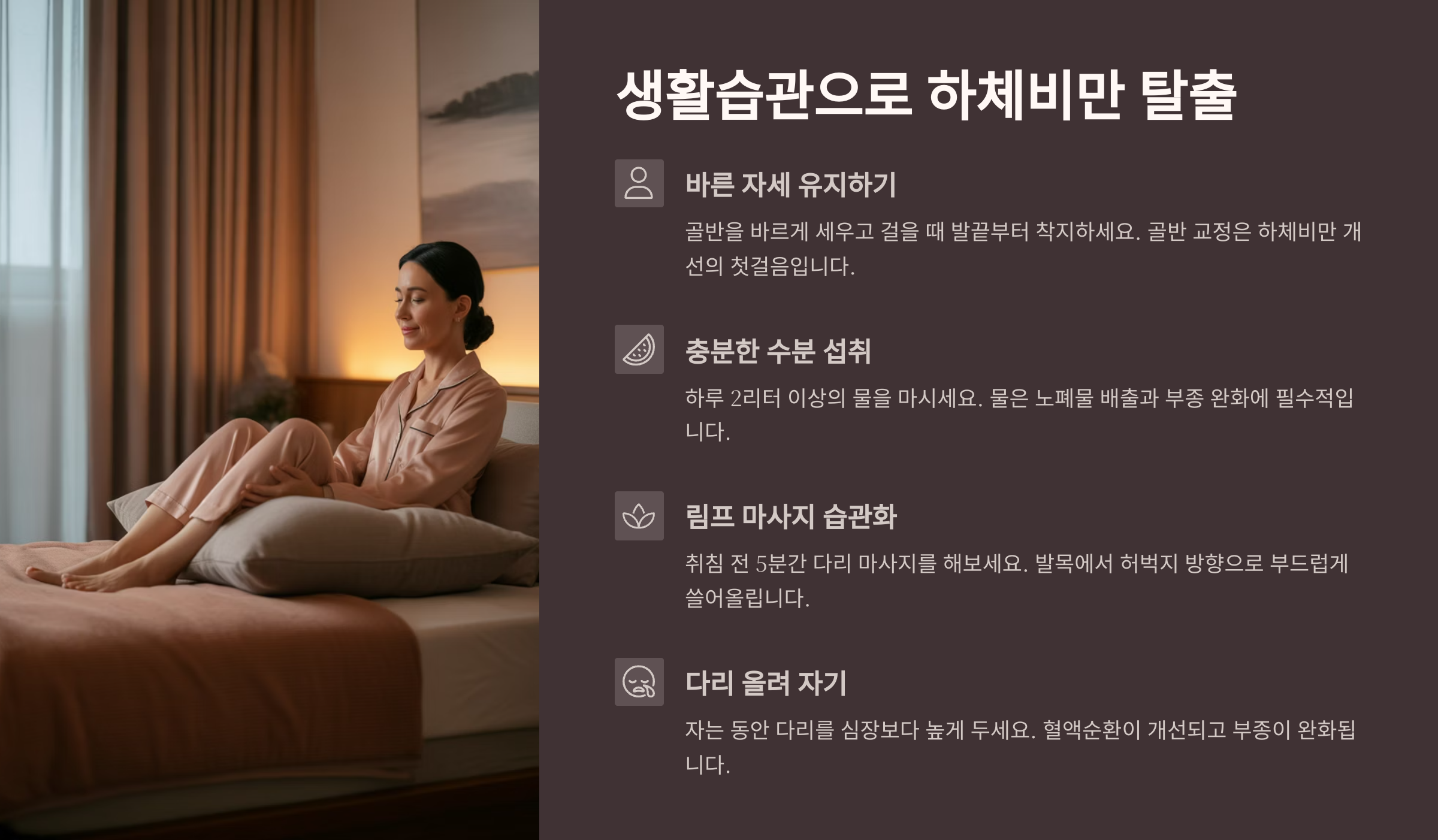 생활습관으로 하체비만 탈출 운동과 식단을 잘 지켜도 생활습관이 엉망이면 하체비만은 쉽게 해결되지 않아요. 그래서 일상 속 작은 습관부터 바꿔야 진짜 변화를 만들 수 있어요. 오늘부터 따라 하면 몸이 확 달라질 수 있답니다! 🔥