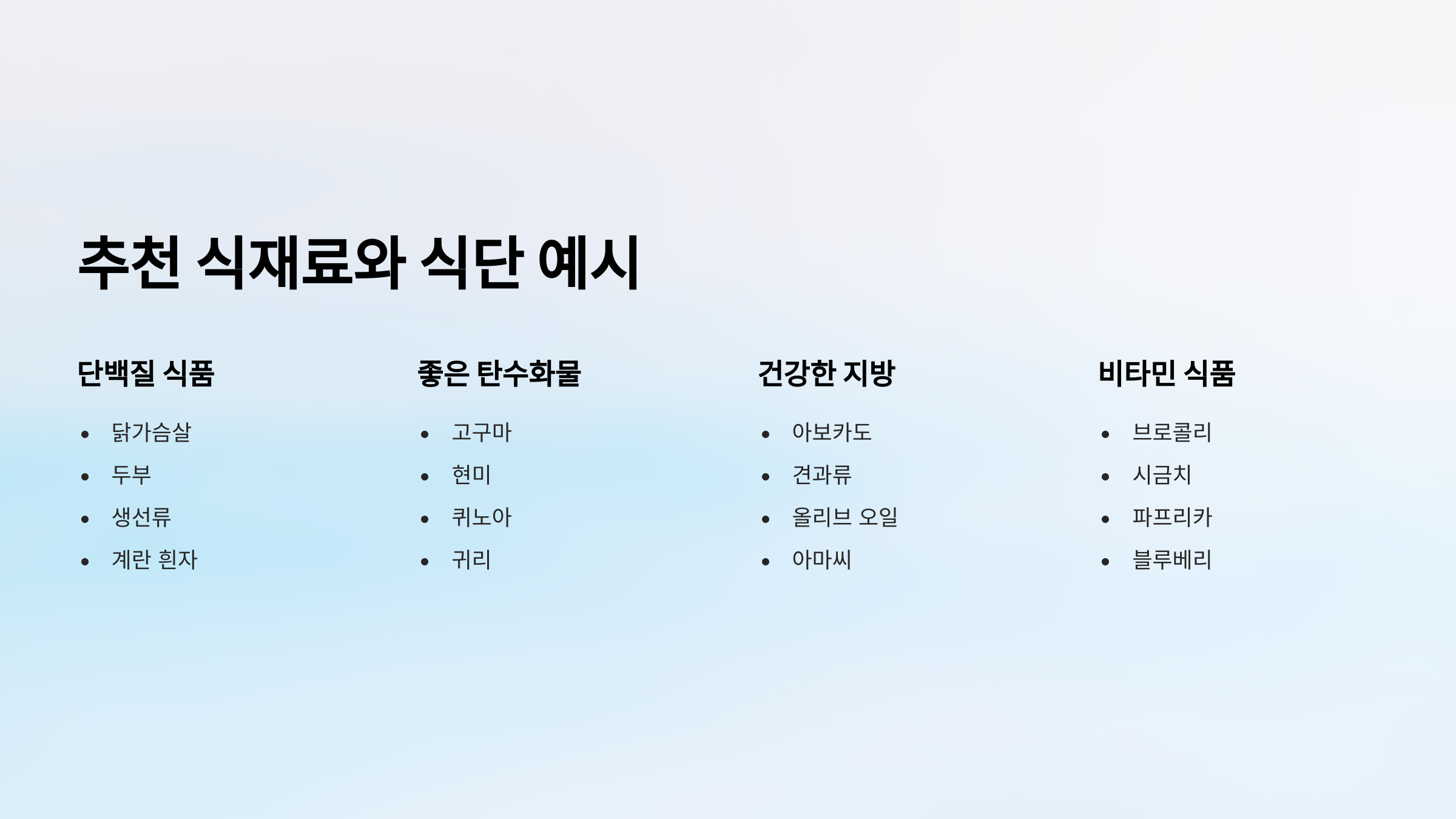 닭가슴살, 두부, 연어 같은 단백질 식품은 필수! 여기에 고구마, 바나나, 아보카도 등도 자주 섭취하면 좋아요.