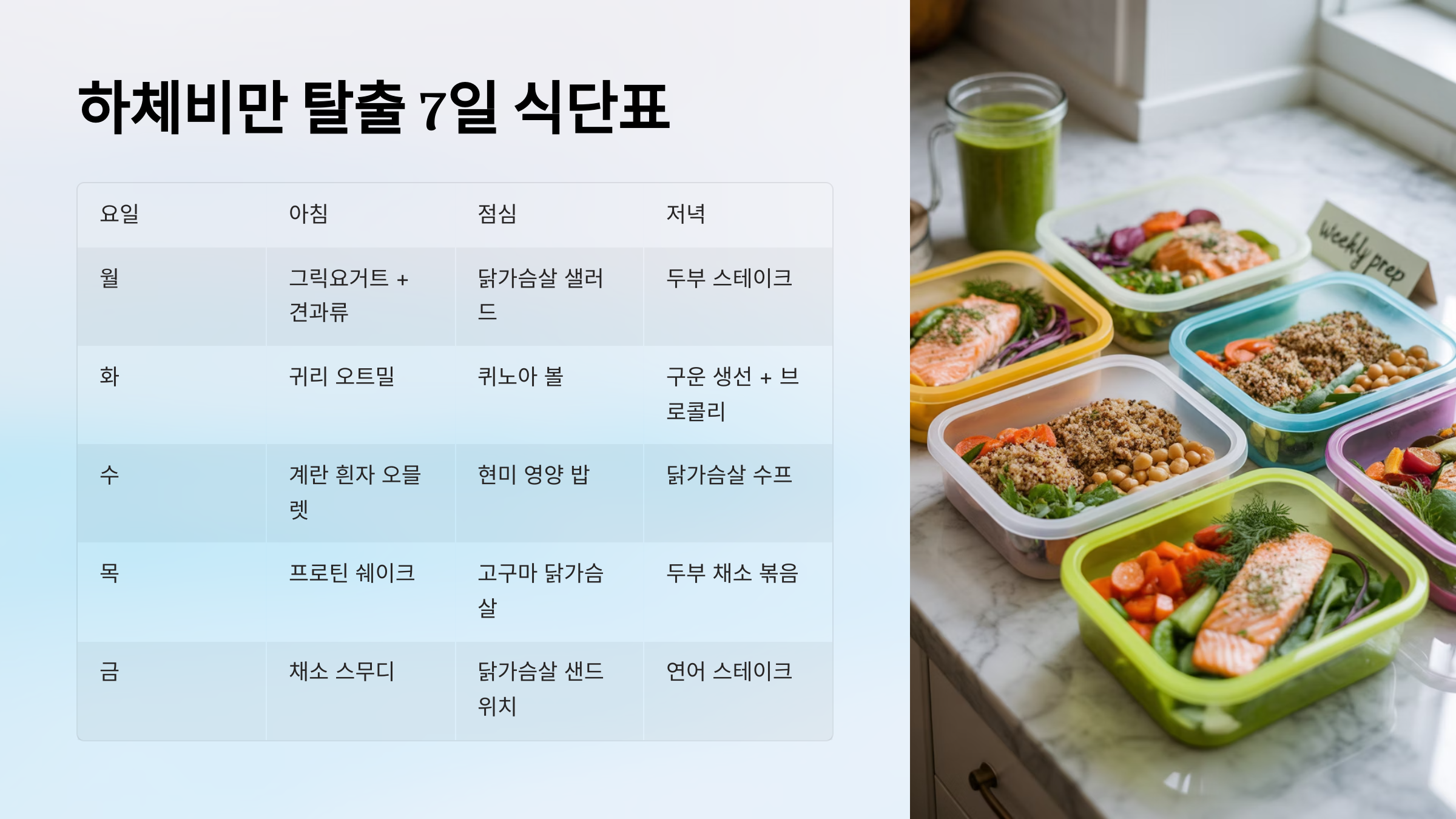 이제 실제로 따라 할 수 있는 7일 식단표를 소개할게요! 매일 간단하지만 효과적인 식단으로 구성했어요. 🎯