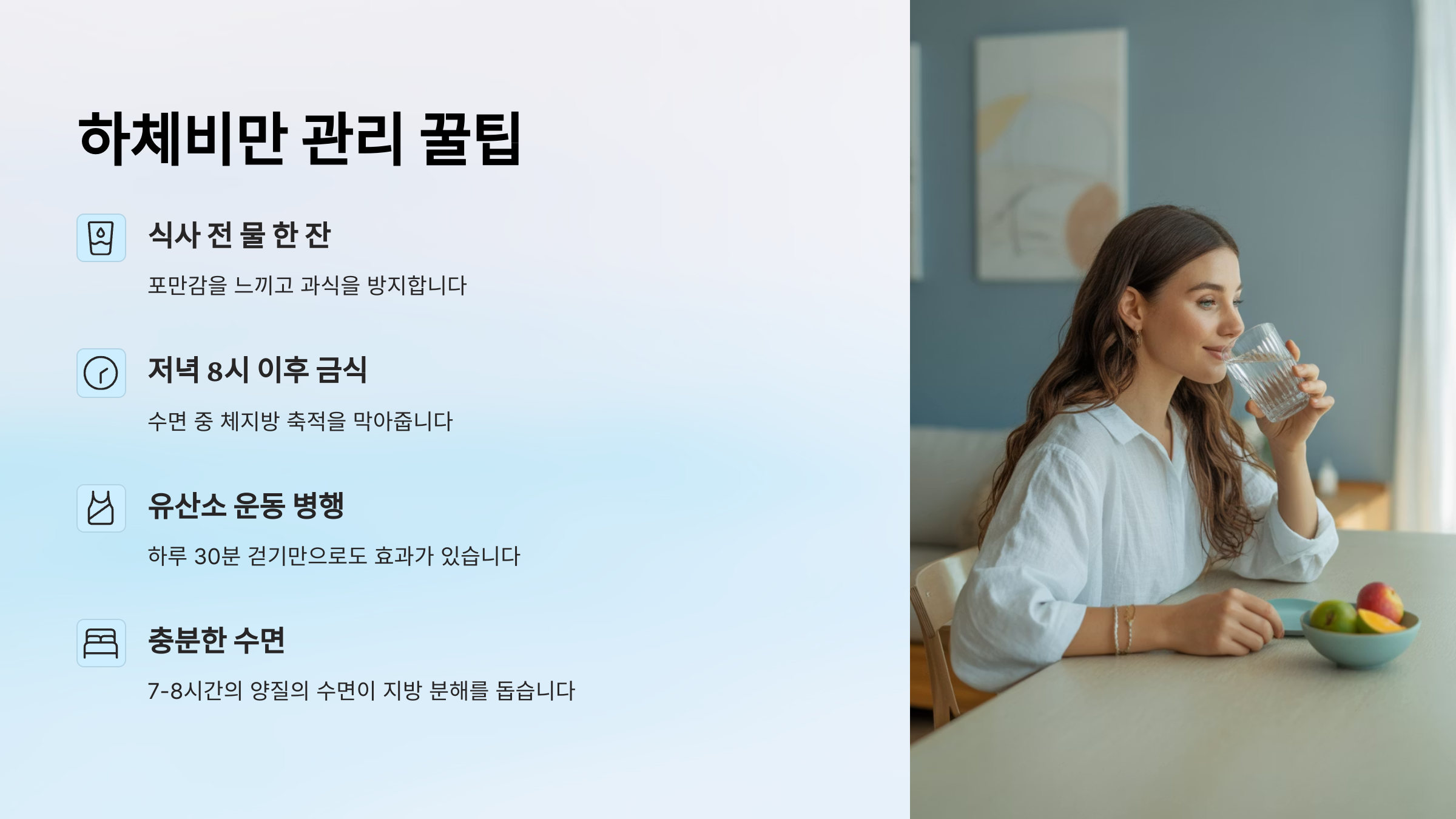 하체비만 관리는 식단뿐만 아니라 생활 습관 전체를 점검해야 해요. 오늘부터 실천할 수 있는 꿀팁을 모아봤어요!