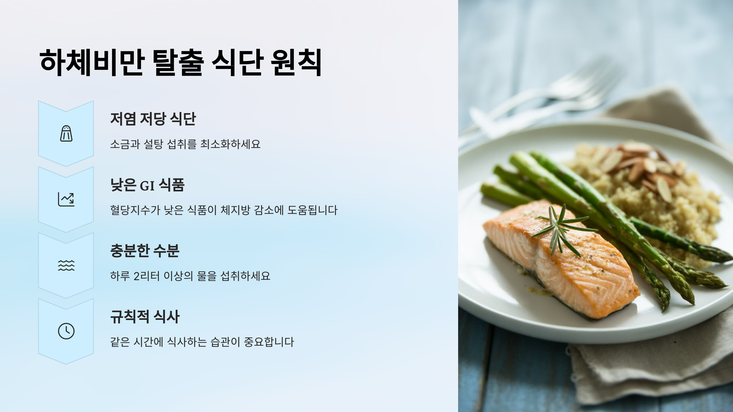 하체비만을 탈출하려면 무엇보다 '균형 잡힌 영양소' 섭취가 중요해요. 특히 단백질 섭취를 늘리고, 나트륨과 단순당 섭취를 줄이는 것이 기본이에요.