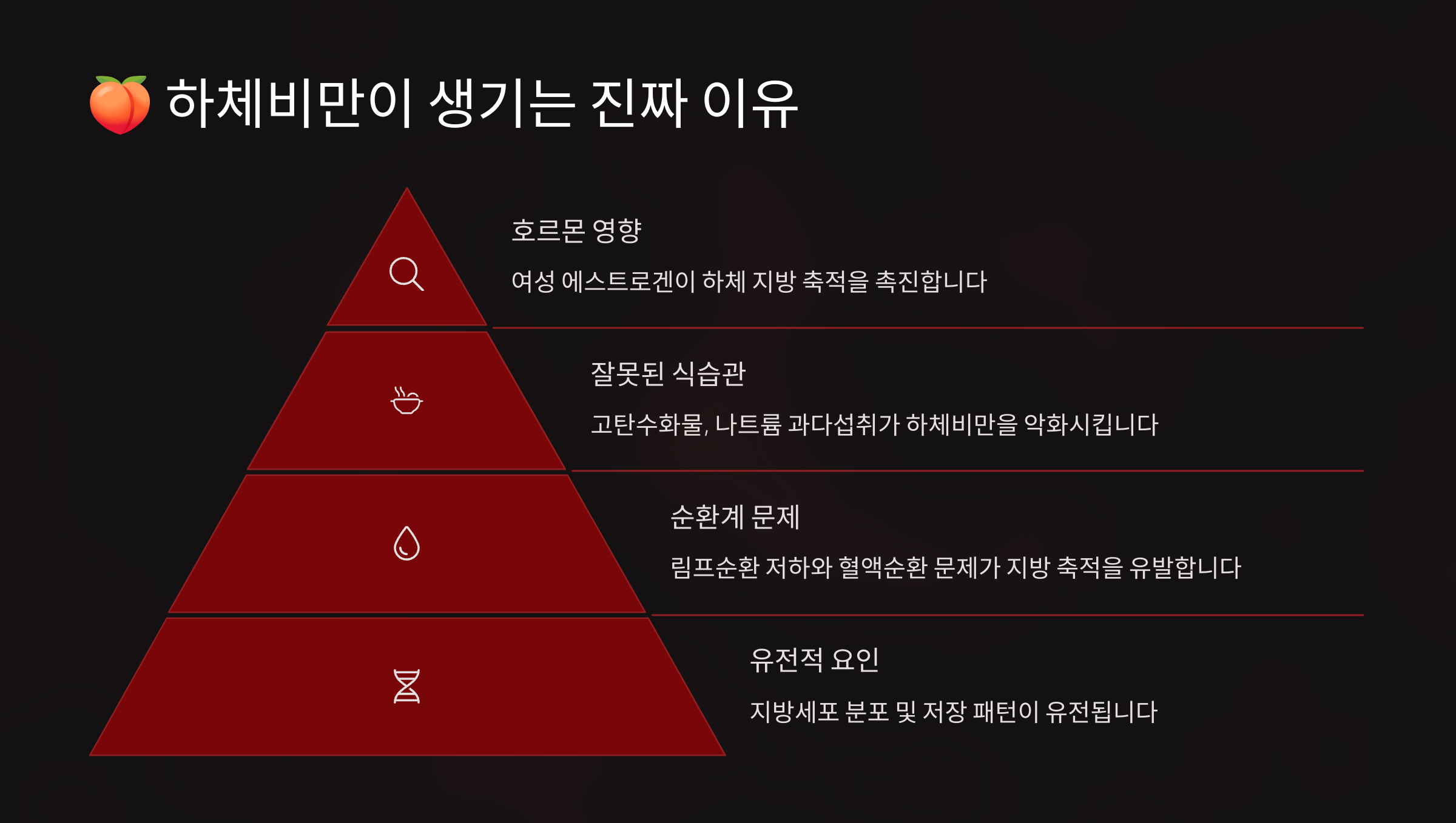 하체비만은 단순히 살이 찐 것 이상의 문제예요. 보통 유전, 호르몬, 생활습관, 잘못된 운동 패턴 등이 복합적으로 작용해요. 특히 여성은 하체에 지방을 저장하는 경향이 강하기 때문에 더욱 쉽게 쌓이죠.가장 흔한 원인은 '순환 장애'에요. 오랜 시간 앉아 있거나 서 있는 습관은 혈액과 림프 순환을 방해해서 하체 부종을 유발해요. 이 부종이 쌓이다 보면 지방으로 고착화되면서 하체비만이 되기 쉽답니다.