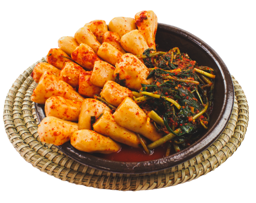총각김치는 작은 무를 통째로 사용하여 만드는 김치입니다. 무의 잎 부분까지 모두 사용하며, 특유의 시원하고 아삭한 맛이 특징입니다.