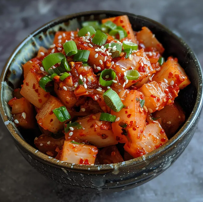 깍두기는 무를 큼직하게 썰어 양념에 버무린 김치입니다. 무의 아삭한 식감과 양념의 매콤한 맛이 조화를 이루어, 특히 고기 요리와 잘 어울립니다.