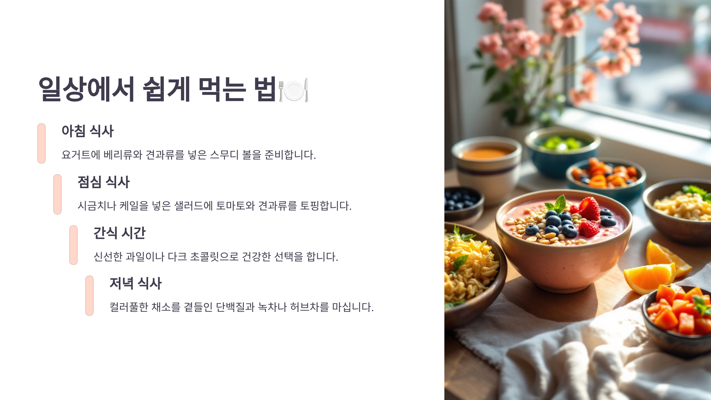 저녁에는 채소 볶음이나 토마토 스튜처럼 따뜻한 요리로 마무리하면 좋답니다. 특히 색이 짙은 채소나 과일을 눈에 띄게 식단에 포함시키는 것도 좋은 방법이에요. 색이 진할수록 항산화 성분도 높거든요!