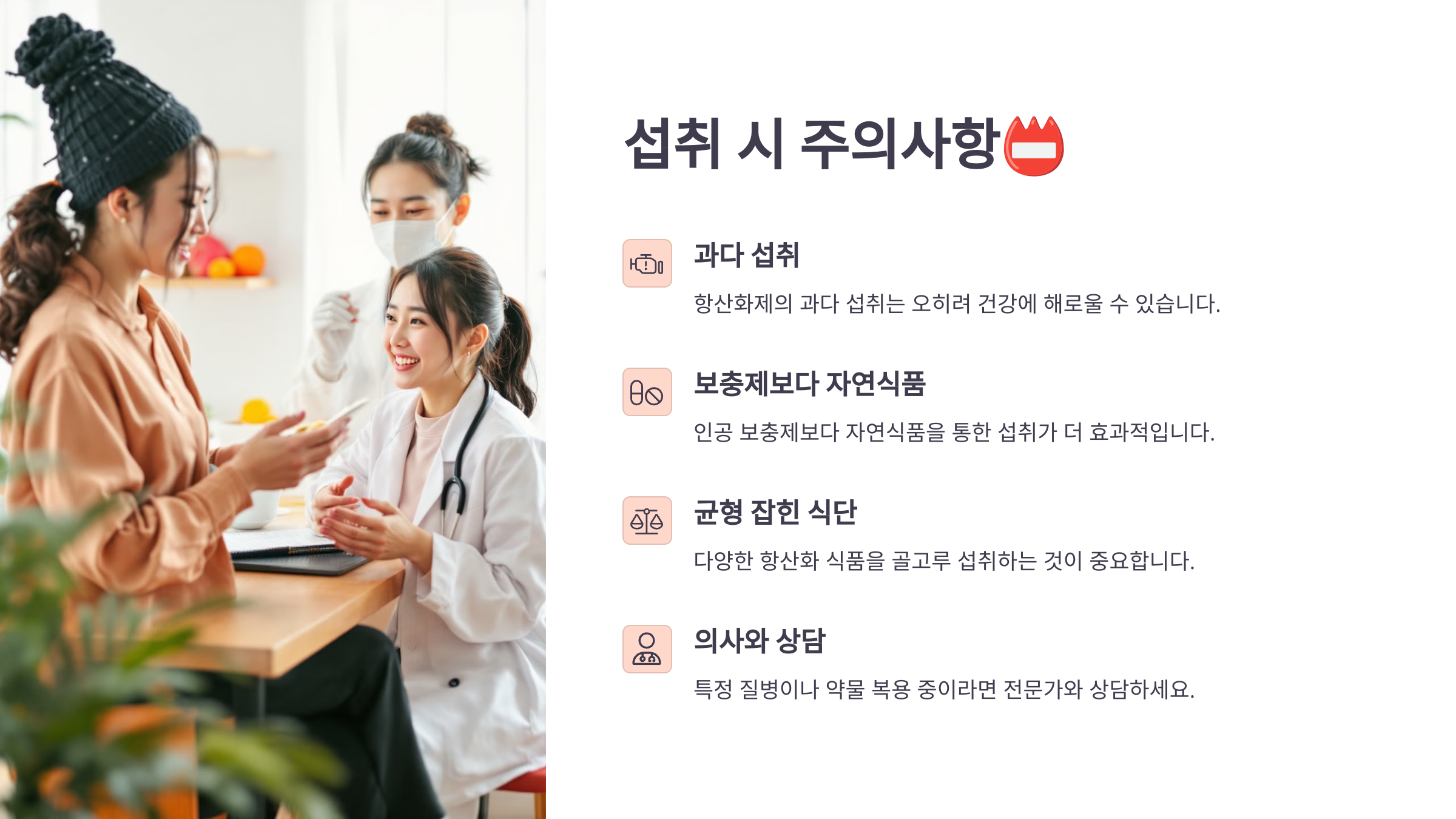 항산화제는 ‘적절한 섭취’가 중요해요. 식품에서 자연스럽게 섭취하는 것을 우선으로 하고, 영양제는 필요 시 전문가 상담을 받은 후에 섭취하는 것이 바람직해요.