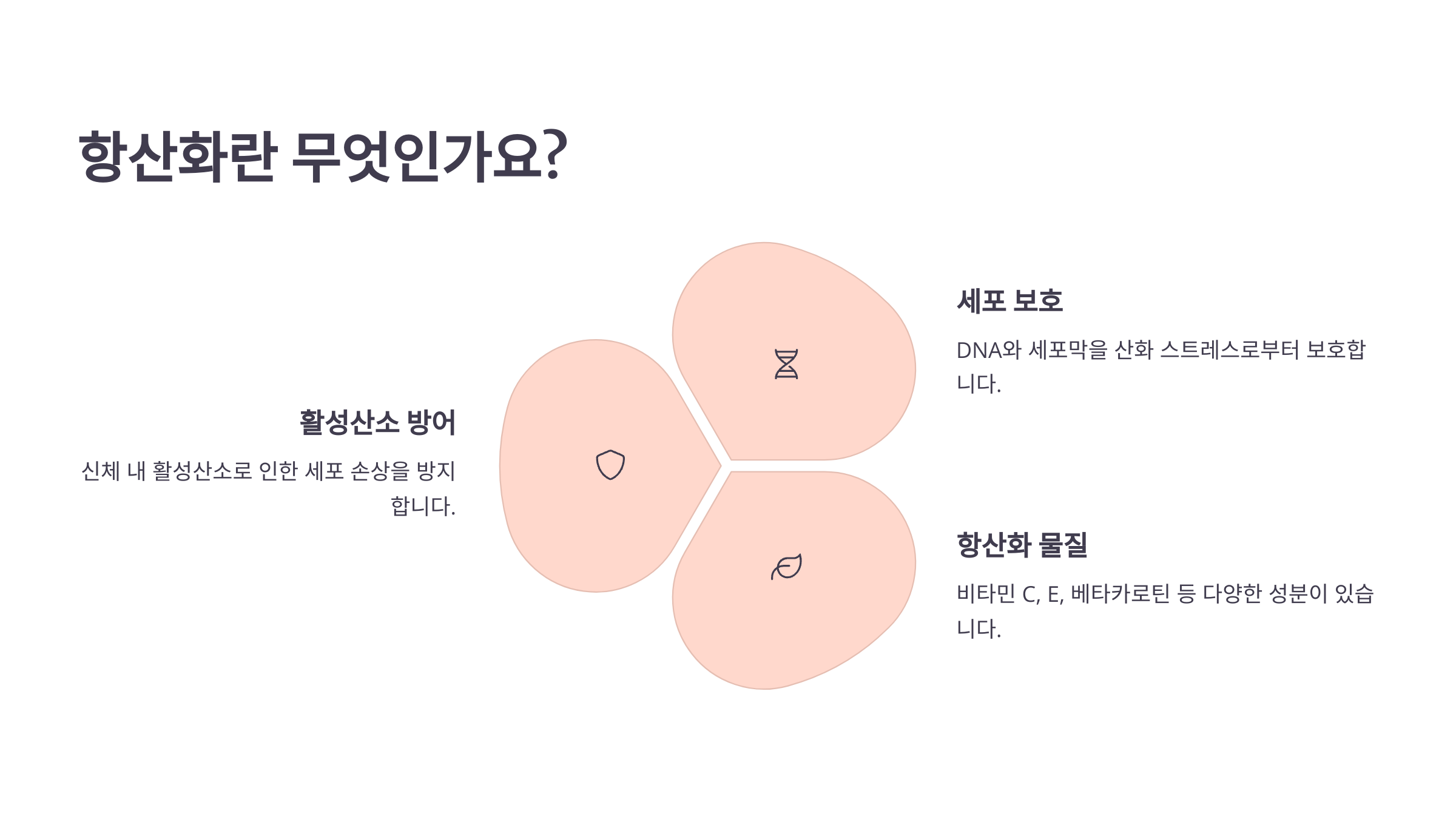 항산화란 우리 몸속에서 발생하는 활성산소를 제거하거나 중화시키는 작용이에요. 활성산소는 스트레스, 오염된 환경, 가공식품 등을 통해 생기며 세포 손상을 유발할 수 있답니다. 그래서 항산화 작용은 건강 유지와 젊음을 지키는 데 중요한 역할을 해요.