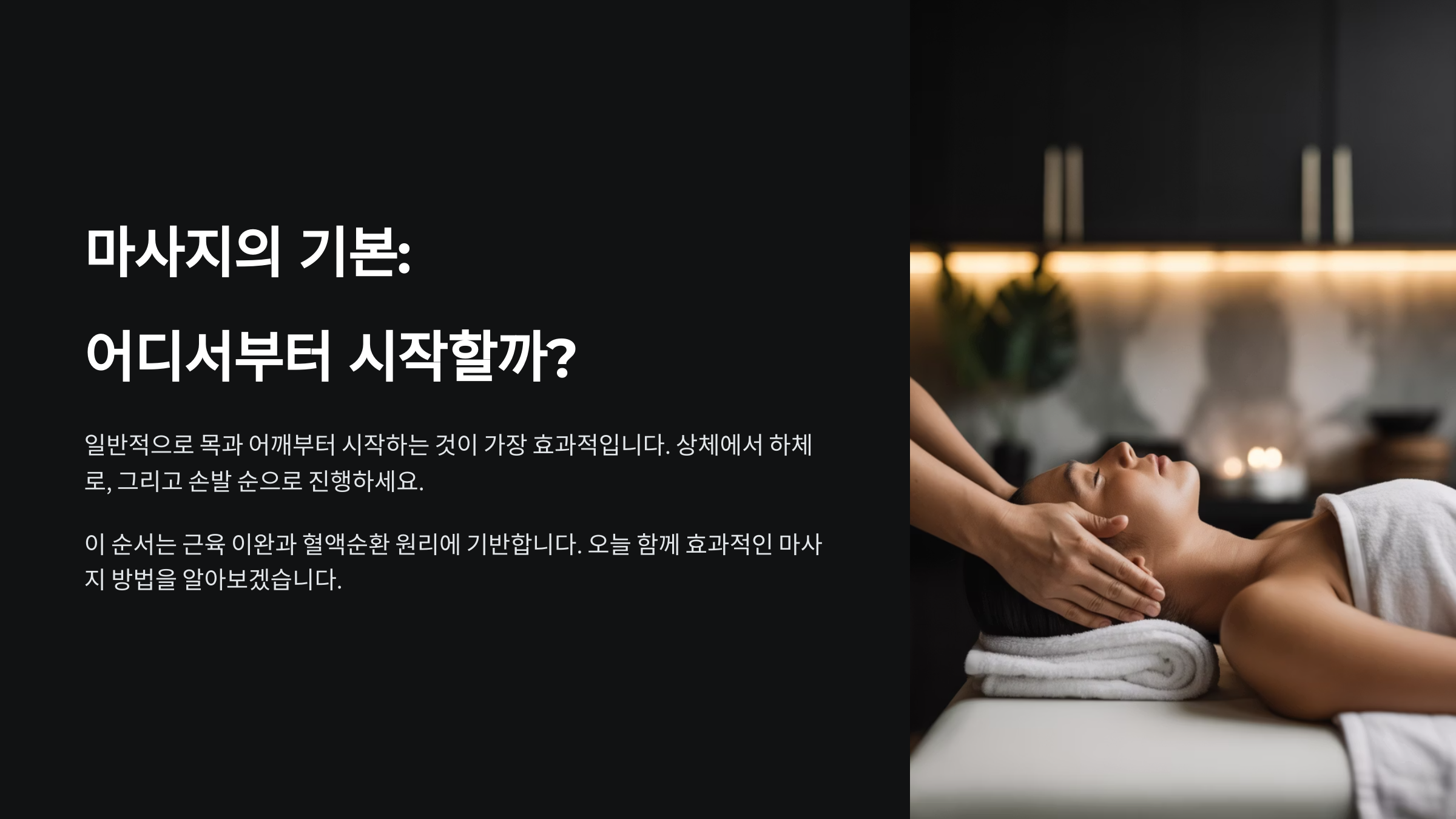 오늘은 마사지할 때 어느 부위부터 시작하면 좋을지, 그리고 어떤 순서와 포인트로 진행해야 몸의 긴장을 효과적으로 풀 수 있는지를 알려드릴게요. 제가 생각했을 때 가장 중요한 건 바로 ‘흐름’이에요. 머리에서 발끝까지 자연스럽게 이어지는 동선이 필요하답니다!