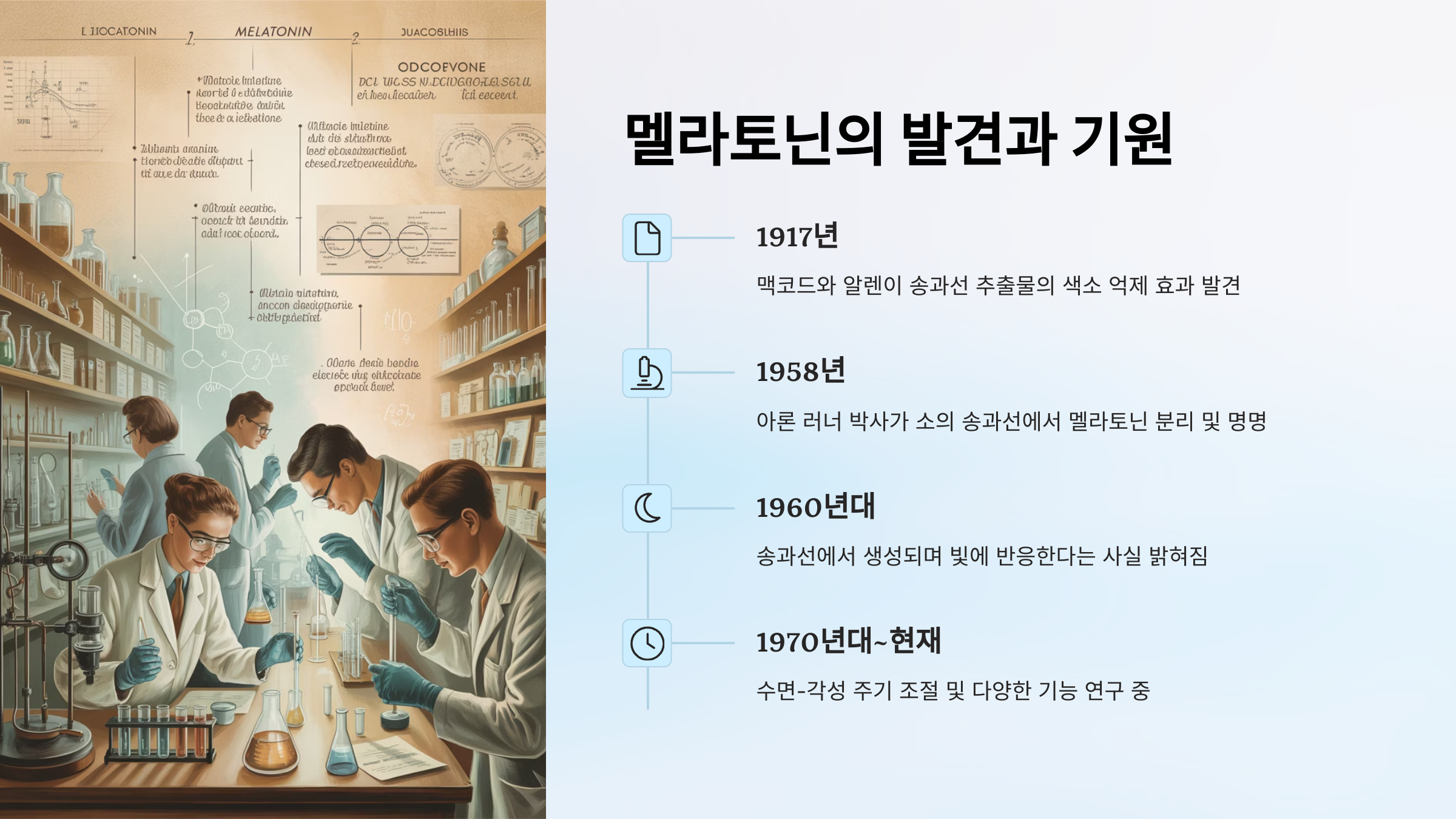 멜라토닌이라는 물질은 1958년 미국 피부과 의사인 에이론 러너(Aaron B. Lerner)에 의해 처음 발견되었어요. 그는 소의 송과선을 연구하다가, 빛의 변화에 따라 피부 색소가 변하는 현상을 관찰하던 중 이 호르몬의 존재를 밝혀냈답니다. 멜라토닌이라는 이름은 '멜라닌(melanin)'과 '토닌(tonin)'을 합쳐 만든 이름이에요.