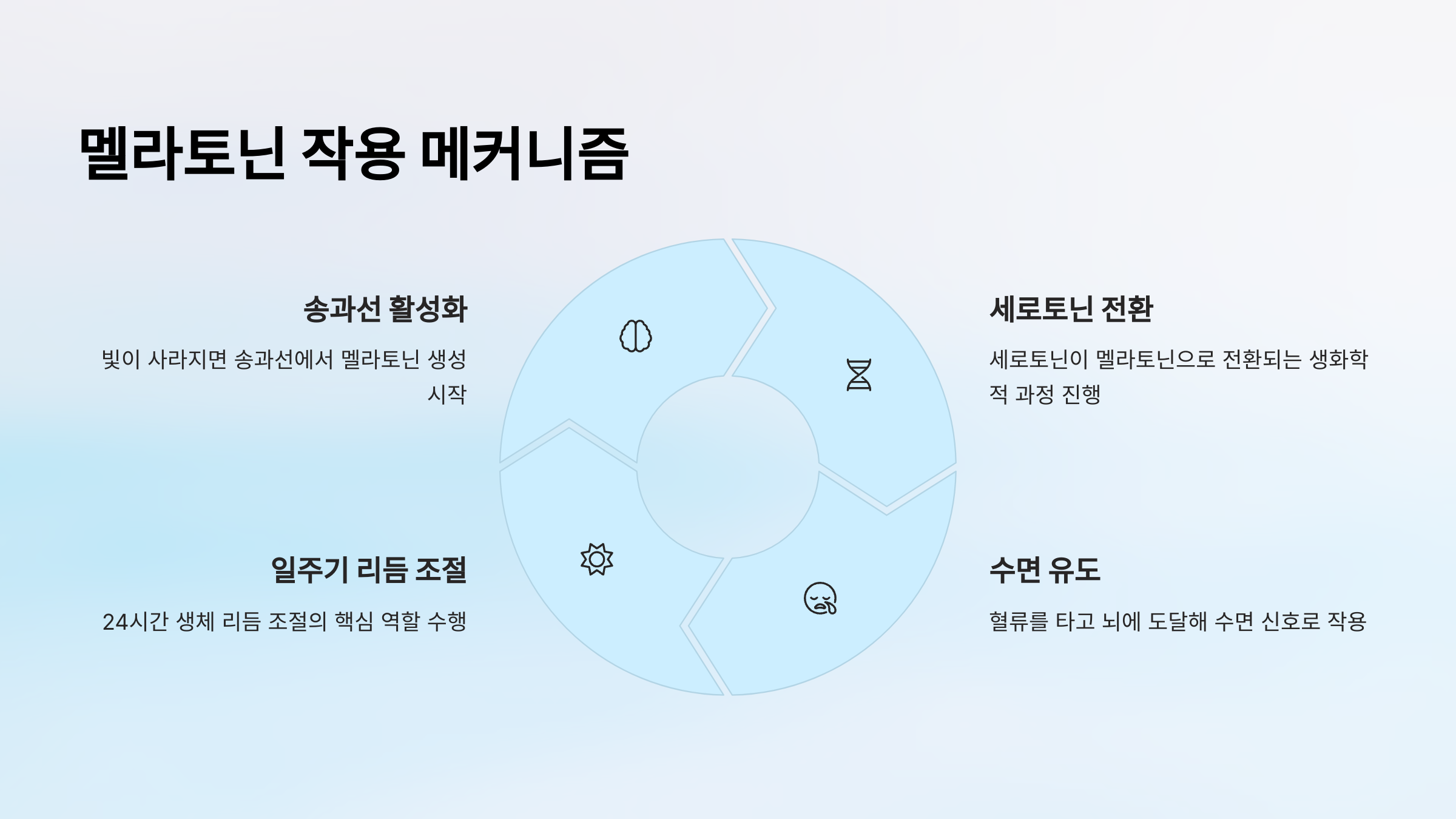 멜라토닌은 '서카디안 리듬(circadian rhythm)'이라고 불리는 생체시계 시스템을 조절하는 핵심 역할을 해요. 서카디안 리듬은 하루 24시간 주기로 작동하면서 우리 몸의 체온, 호르몬 분비, 수면 패턴 등을 일정하게 유지하게 도와줘요. 이 리듬이 빛의 유무에 따라 조절되는데, 바로 멜라토닌이 그 중심에 있어요.