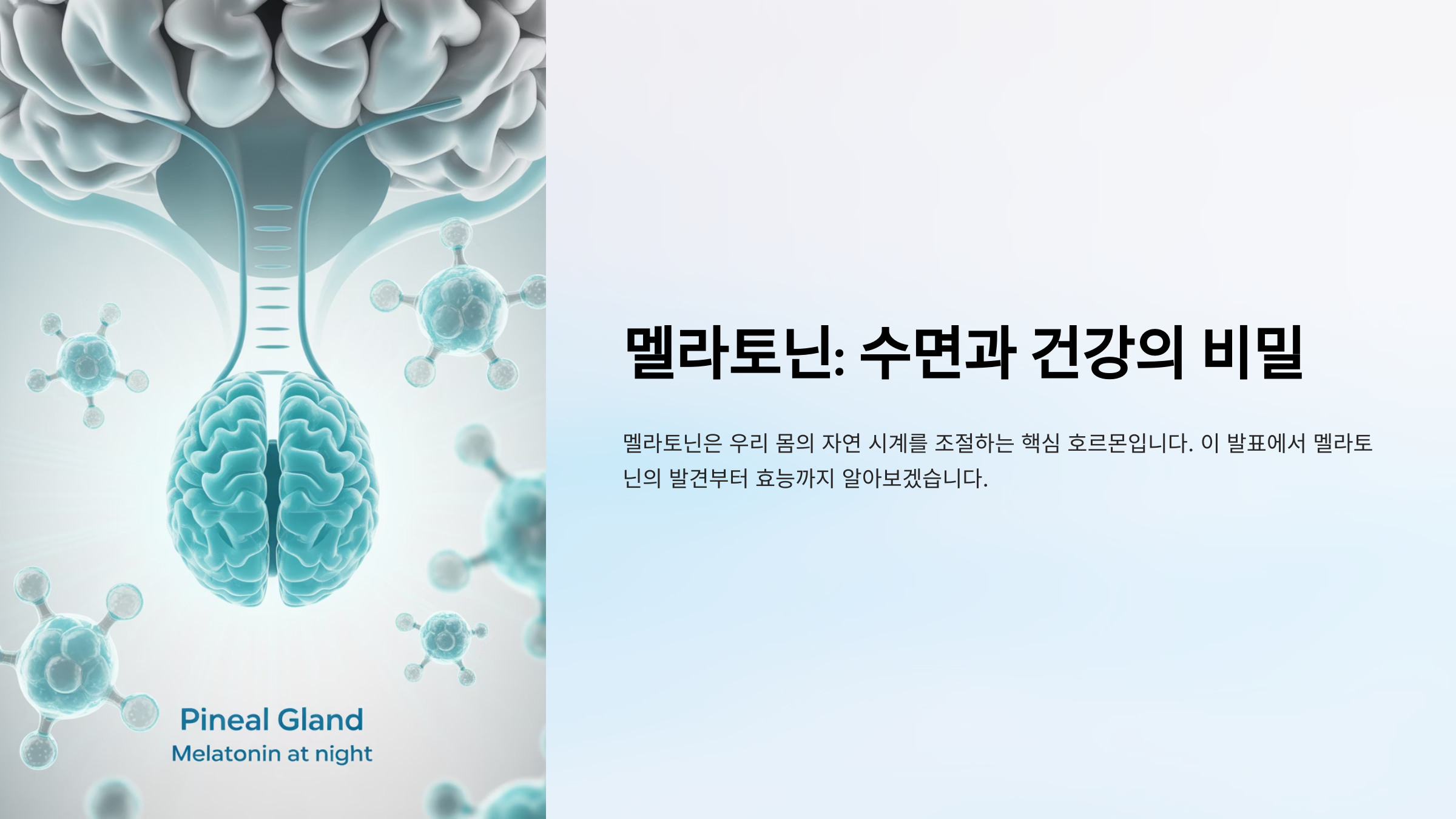 멜라토닌은 뇌에서 자연스럽게 생성되는 호르몬으로, 우리가 밤이 되면 졸음을 느끼게 만드는 역할을 해요. '수면 호르몬'이라고도 불리며 생체 리듬, 특히 '하루 주기 리듬(서카디안 리듬)'을 조절하는 데 필수적인 물질이랍니다.