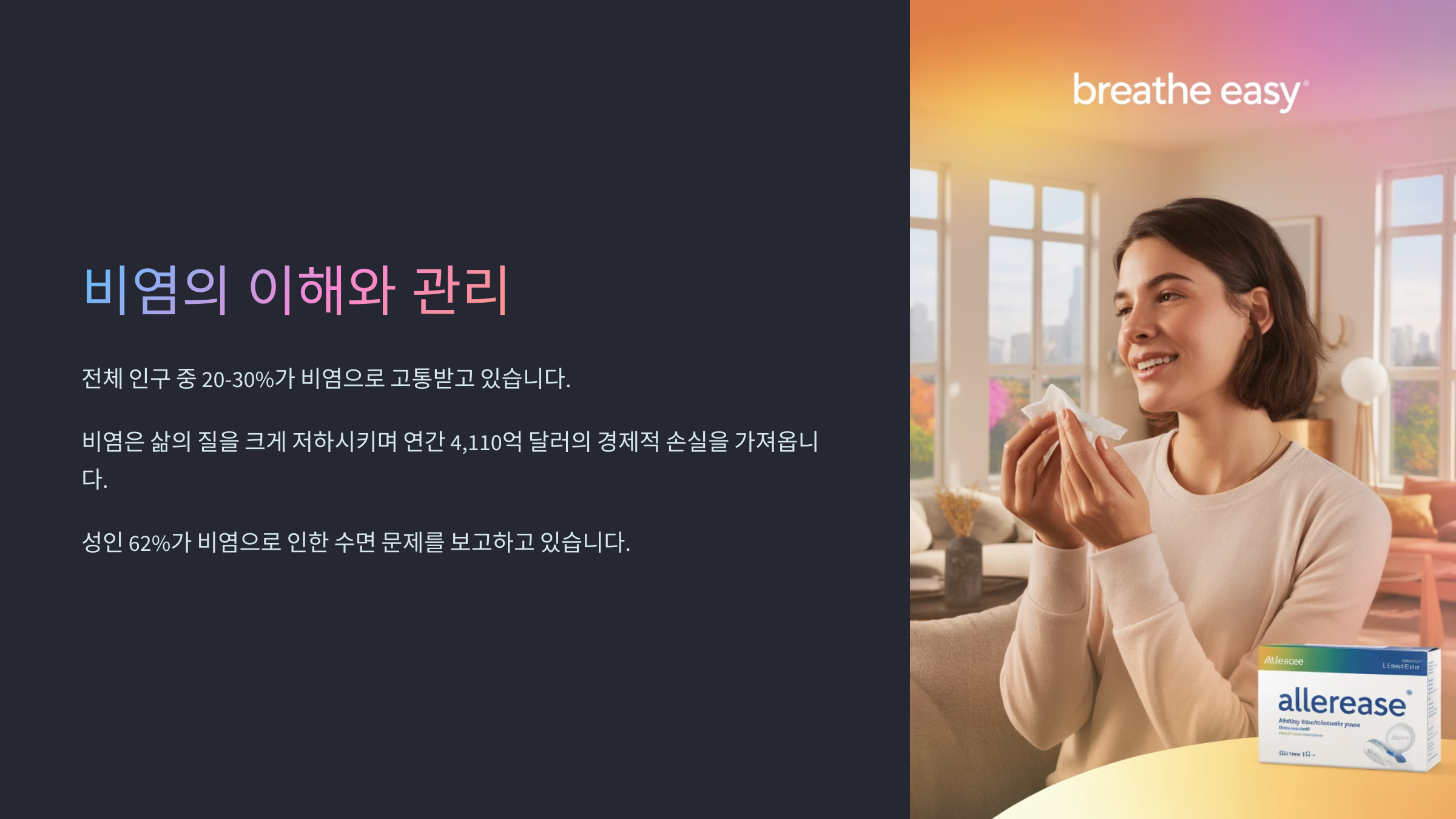 비염이 심해지면 일상생활에 큰 불편함이 생겨요. 예를 들어 수업 시간이나 회의 중에 연신 코를 훌쩍이게 되면 눈치가 보이고, 집중력이 떨어지죠. 숨쉬기가 불편하니 운동도 어렵고, 감기와 헷갈리기 쉬워서 주변의 오해도 받아요.