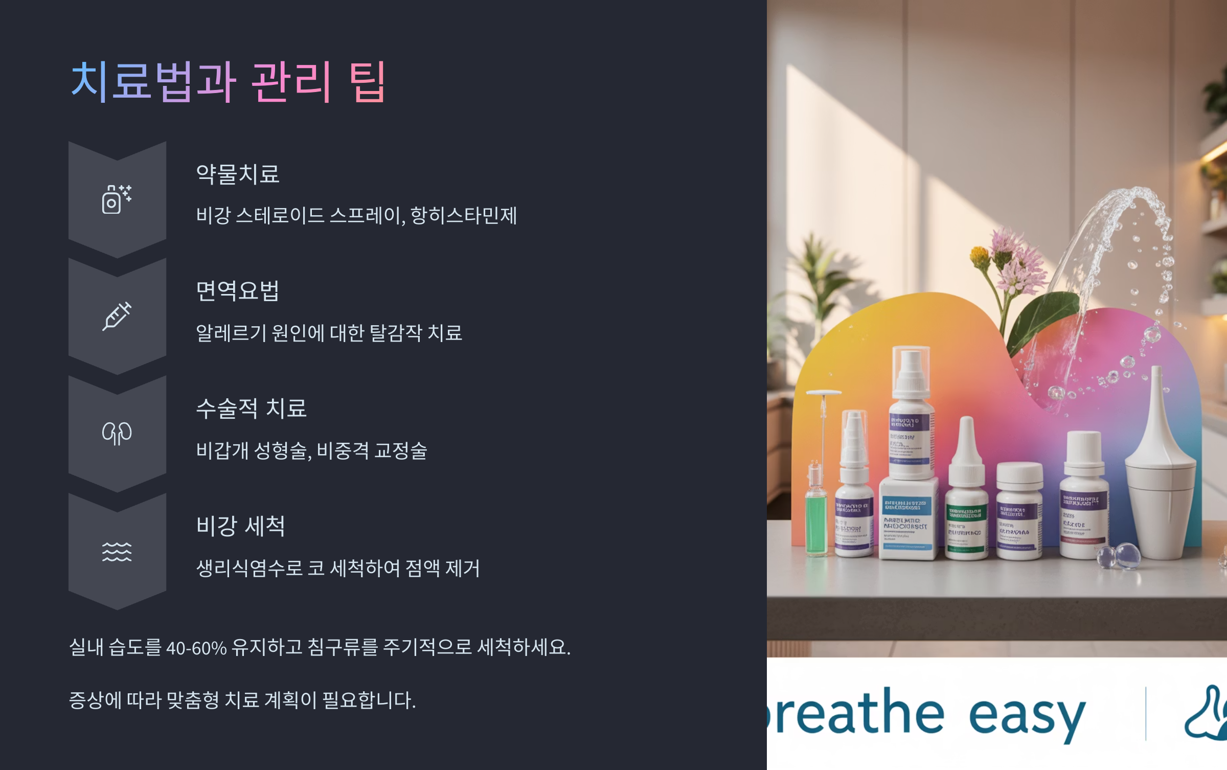 비약물적 치료법도 있어요. 알레르기 유발 요인을 피하고, 실내 습도를 적절히 유지하는 것이 기본이에요. 세척용 식염수를 이용한 코세척도 효과적인데요, 특히 하루 1~2회 미온수로 코를 세척하면 증상 완화에 큰 도움이 돼요.